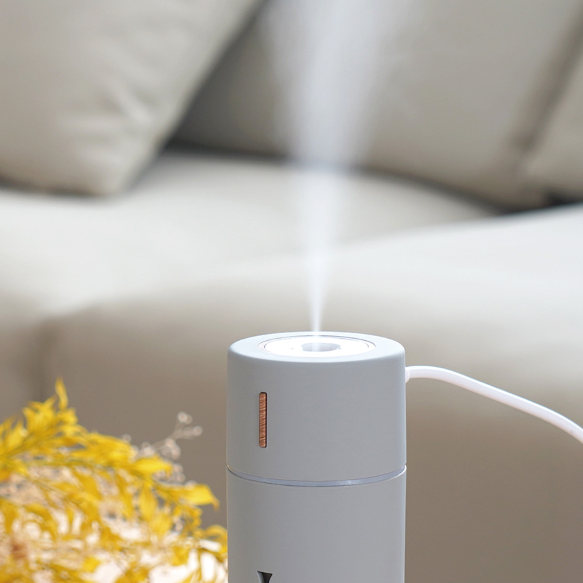 シンプルなボタン操作で噴霧口の切り替え、ランプの切り替えができます。電源はパソコンやUSBバッテリーからのUSB給電に対応しています。