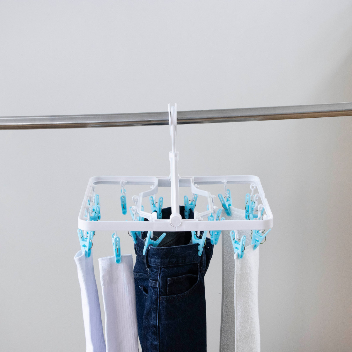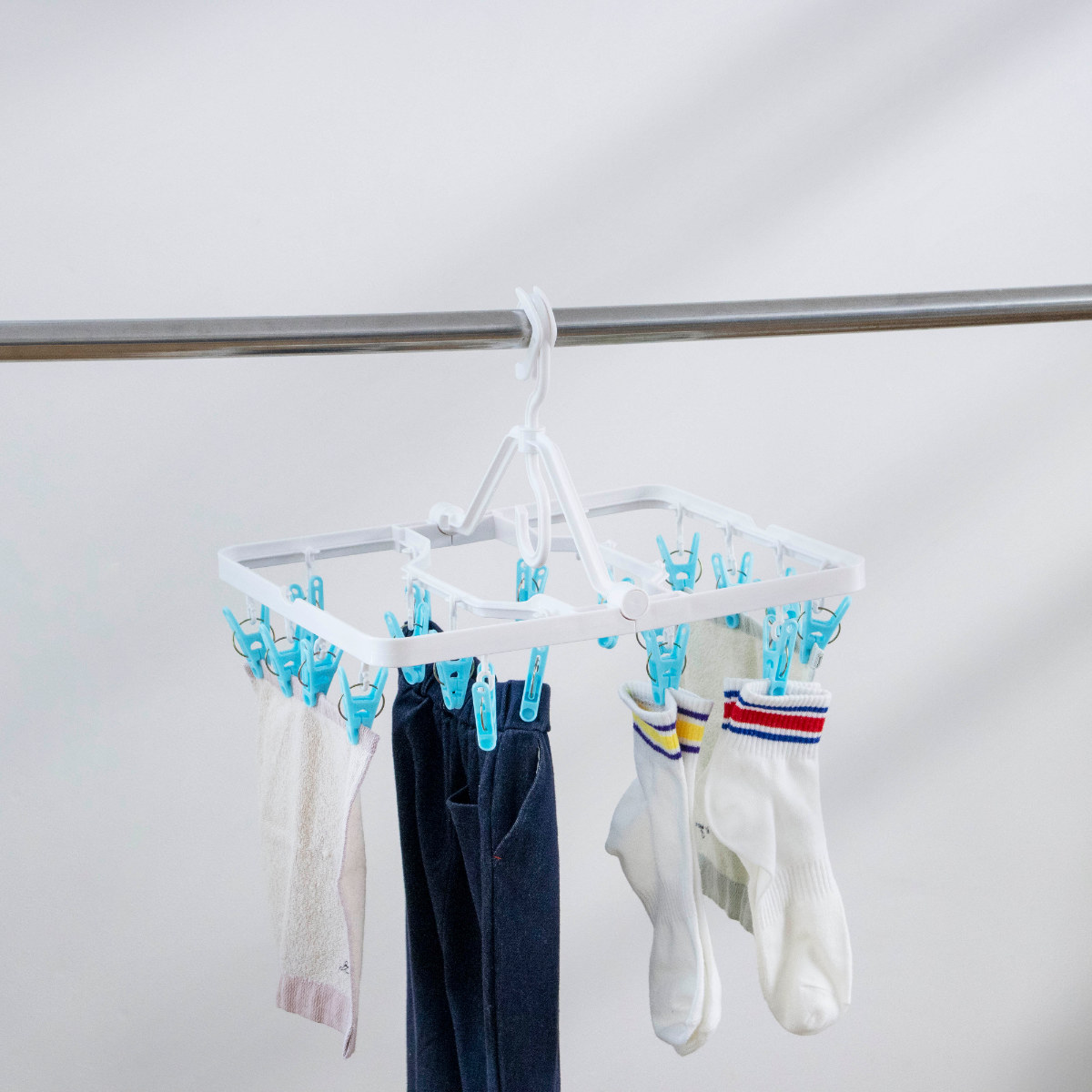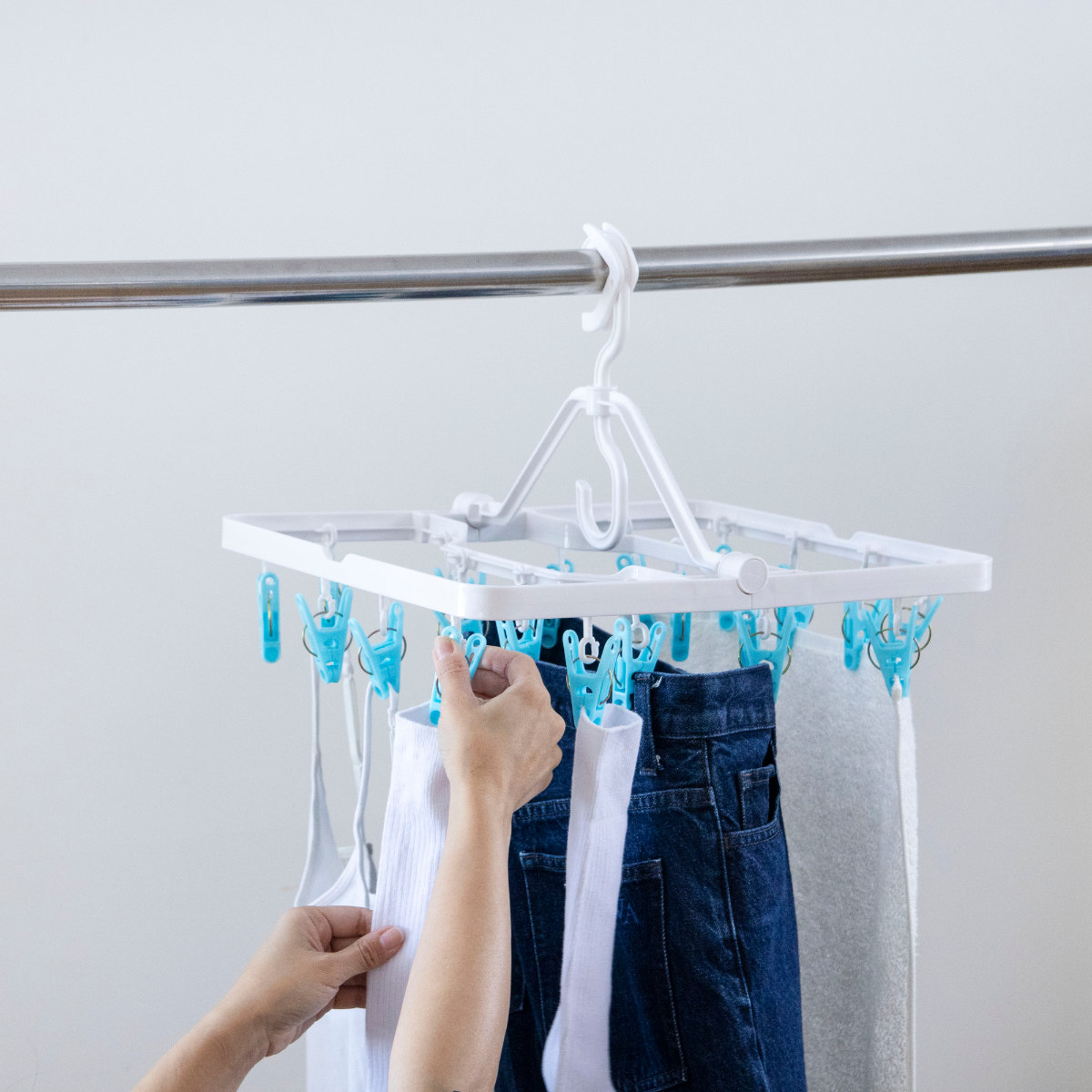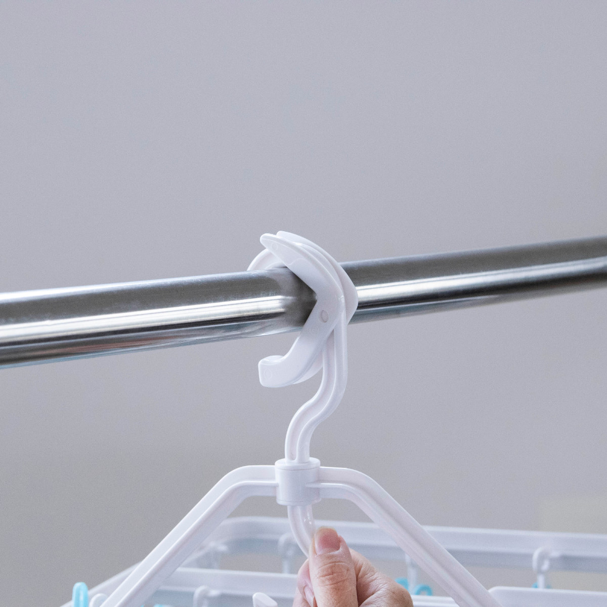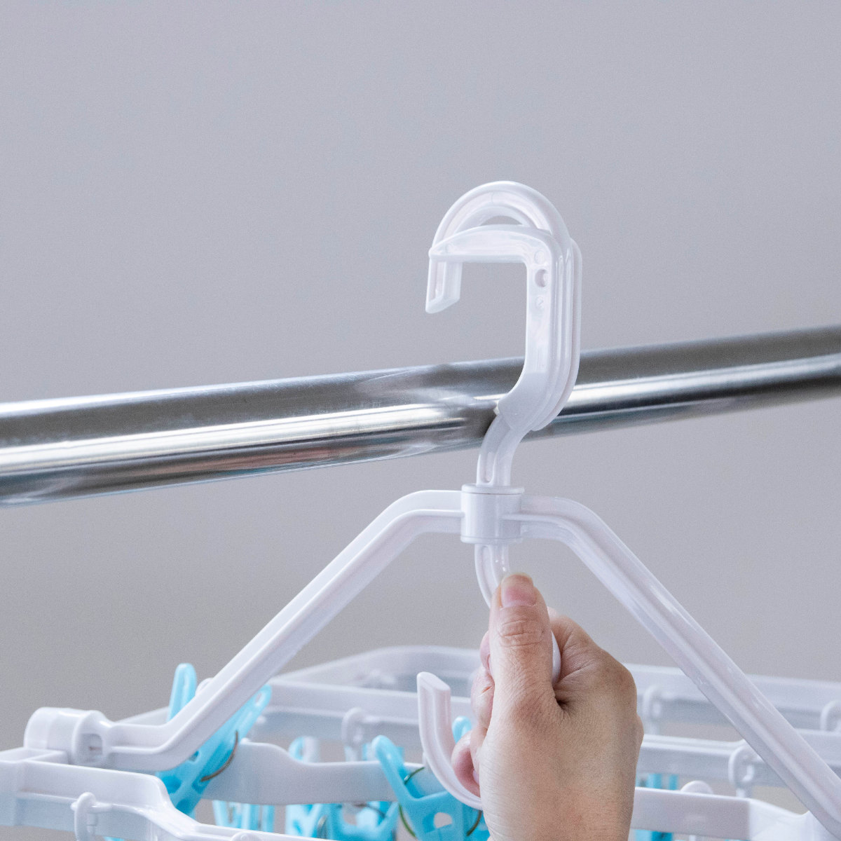 物干し竿に掛けるだけで安定して固定できるロックフックを採用しています。風が吹いても外れにくく安心で、外す際も簡単な操作でスムーズに取り外せます。