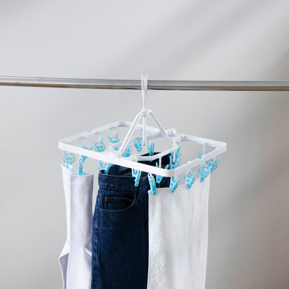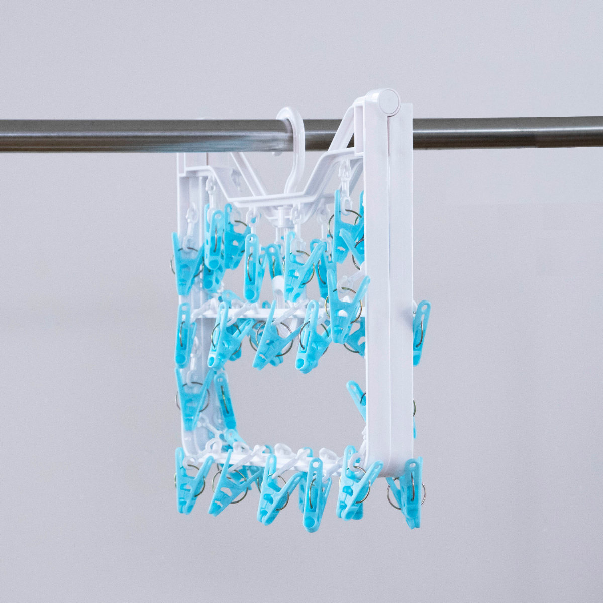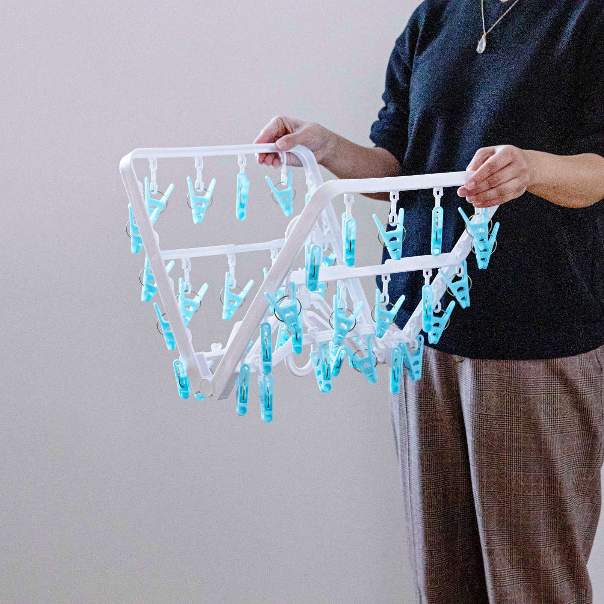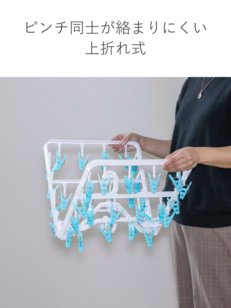 上折れ式構造を採用しているため、ピンチ同士が重なったり絡まったりしにくいのが特長です。干す・取り込む作業がスムーズに行え、次に使う際もサッと広げてすぐに干せます。