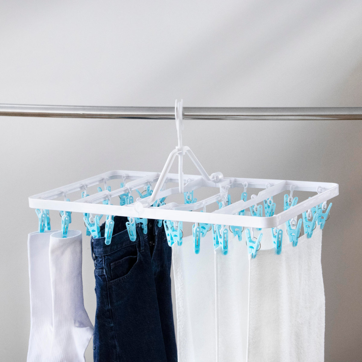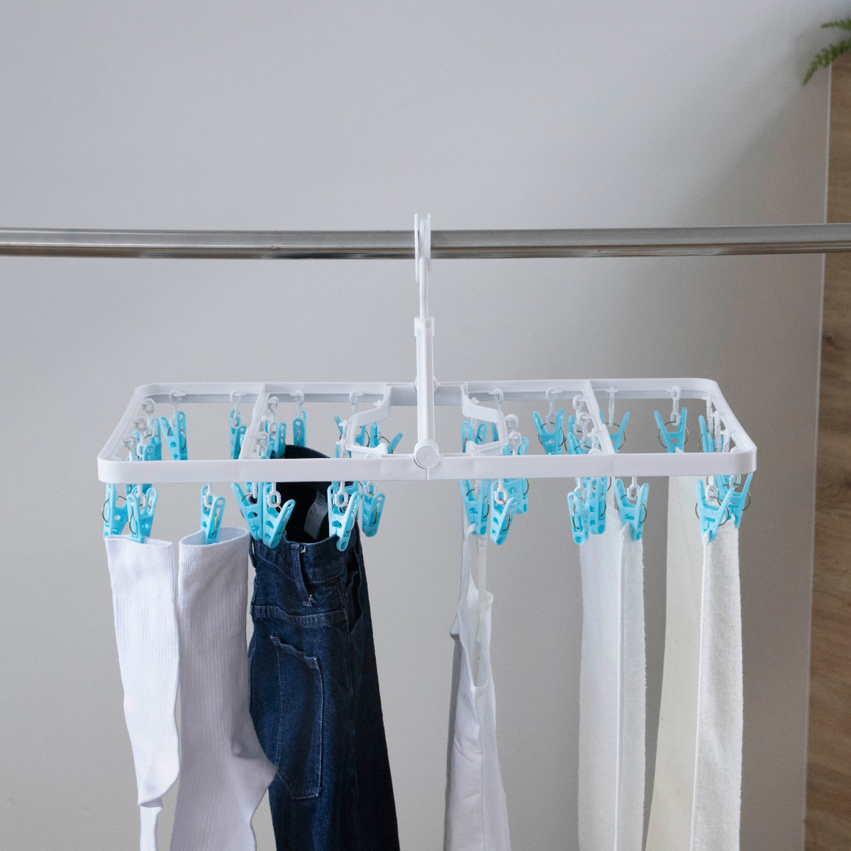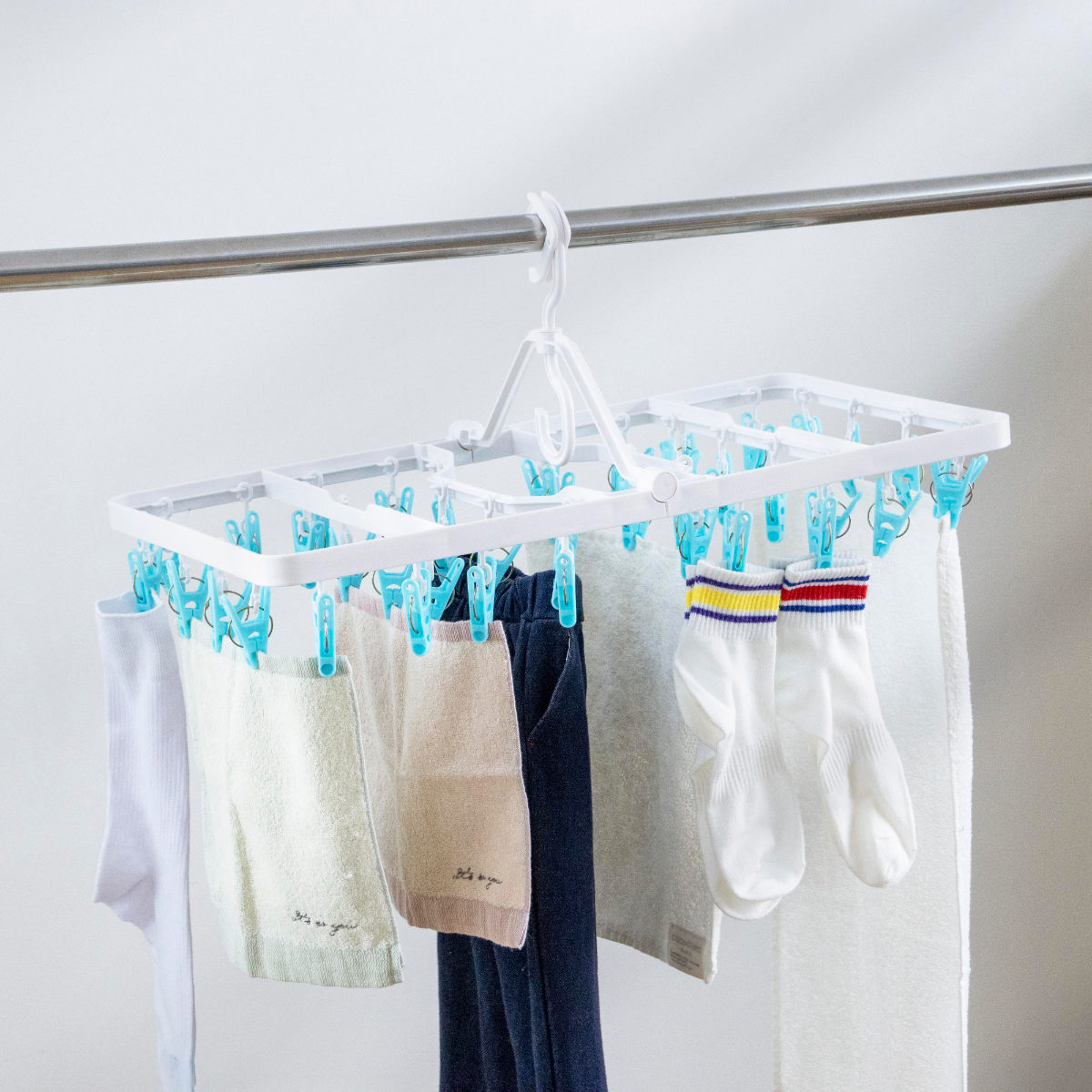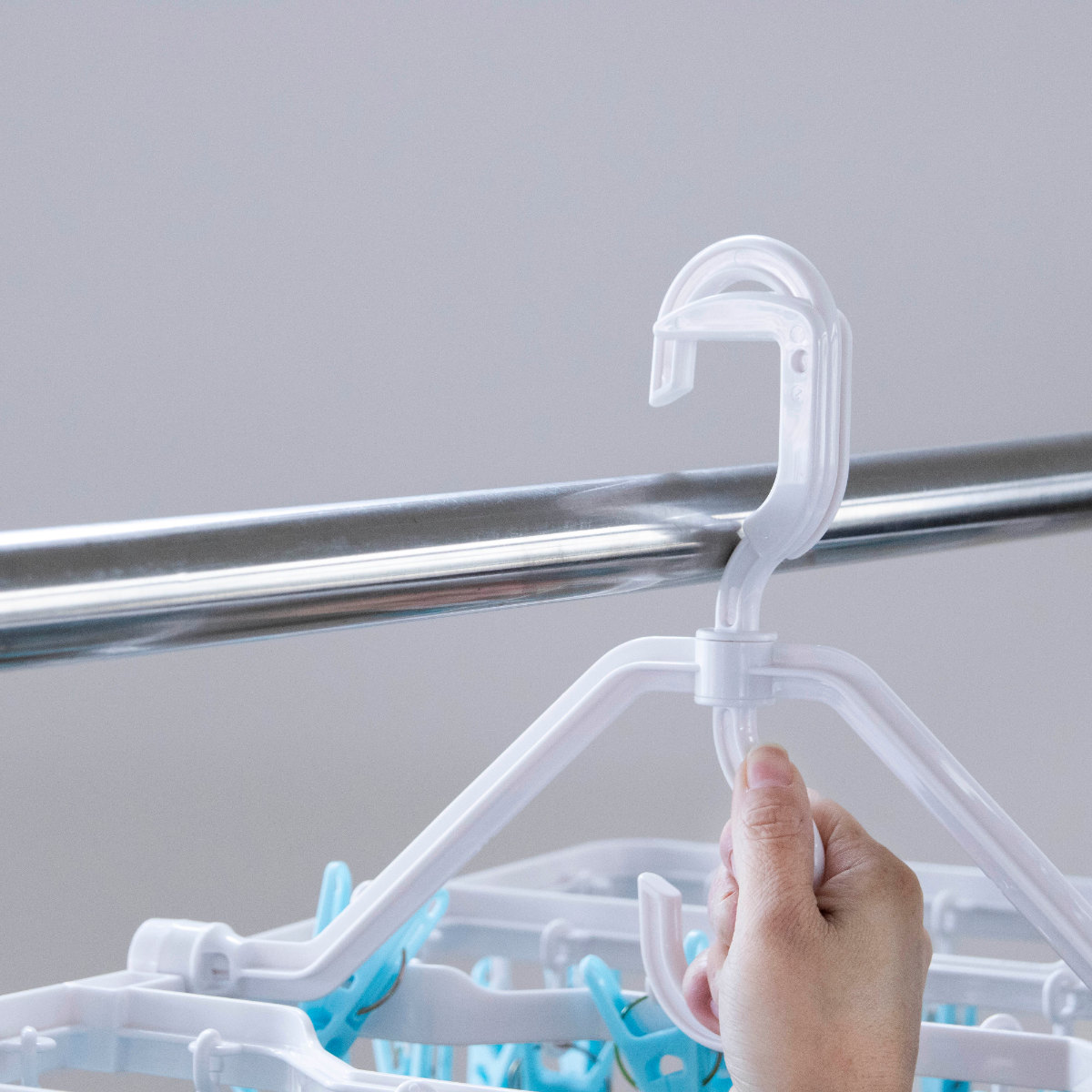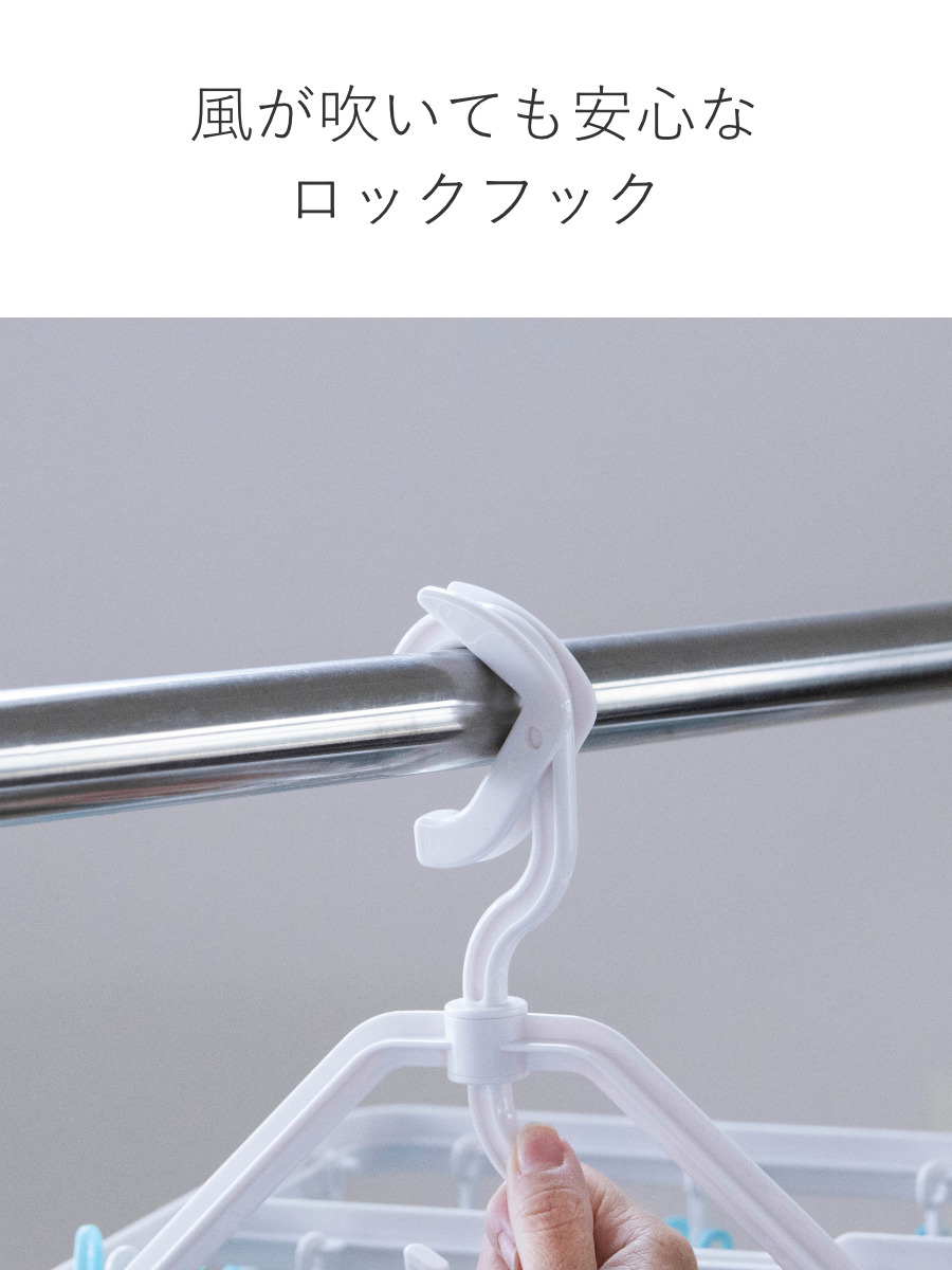 物干し竿に掛けるだけで安定して固定できるロックフックを採用しています。風が吹いても外れにくく安心で、外す際も簡単な操作でスムーズに取り外せます。