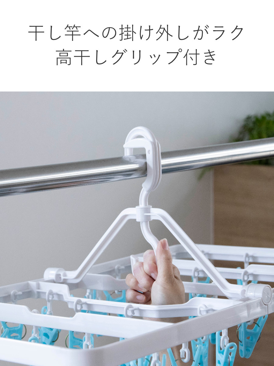 高干しグリップ付きで、高い物干し竿への掛け外しもラクに行えます。背伸びをしにくく、毎日の洗濯作業の負担を軽減します。