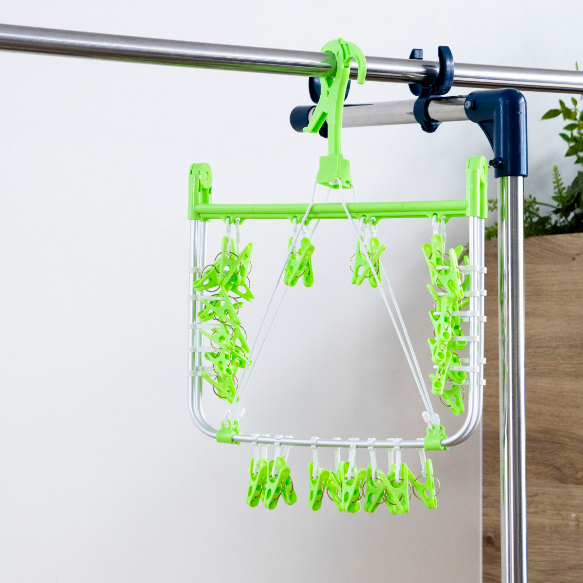 ピンチが20個付いたアルミフレームの角ハンガーです。少量の洗濯物を効率よく干したい一人暮らしの方におすすめなサイズです。アルミ製なので軽量で持ち運びも便利です。