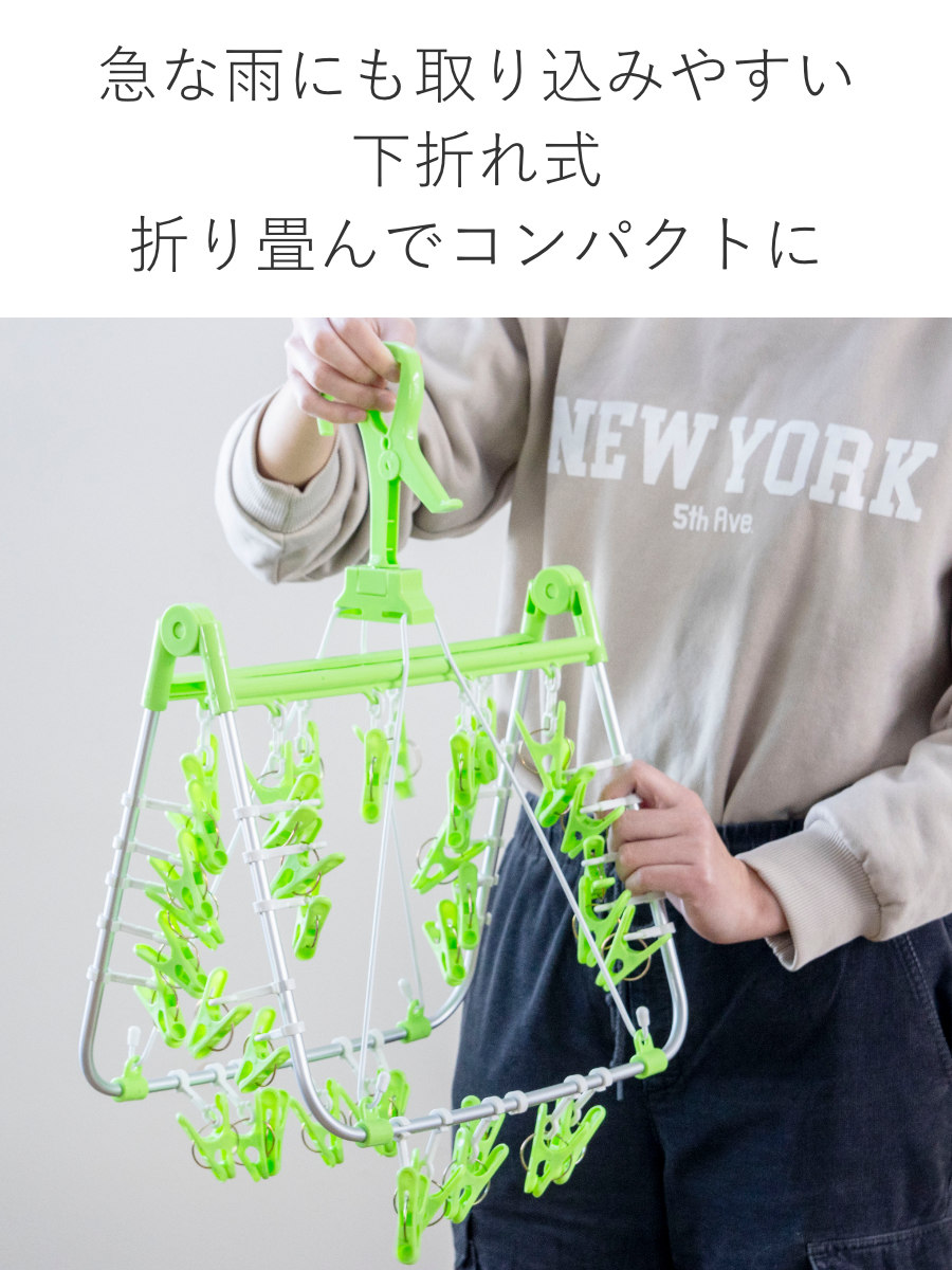 急な降雨時などに洗濯物を取り込みやすい下折れ式です。洗濯物を干したまま一気にサッと取り込めて時短になります。また、使わない時は折り畳んでコンパクトになります。