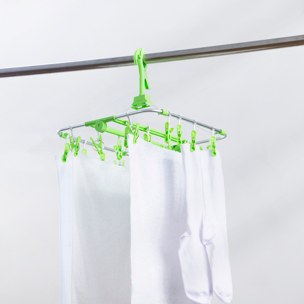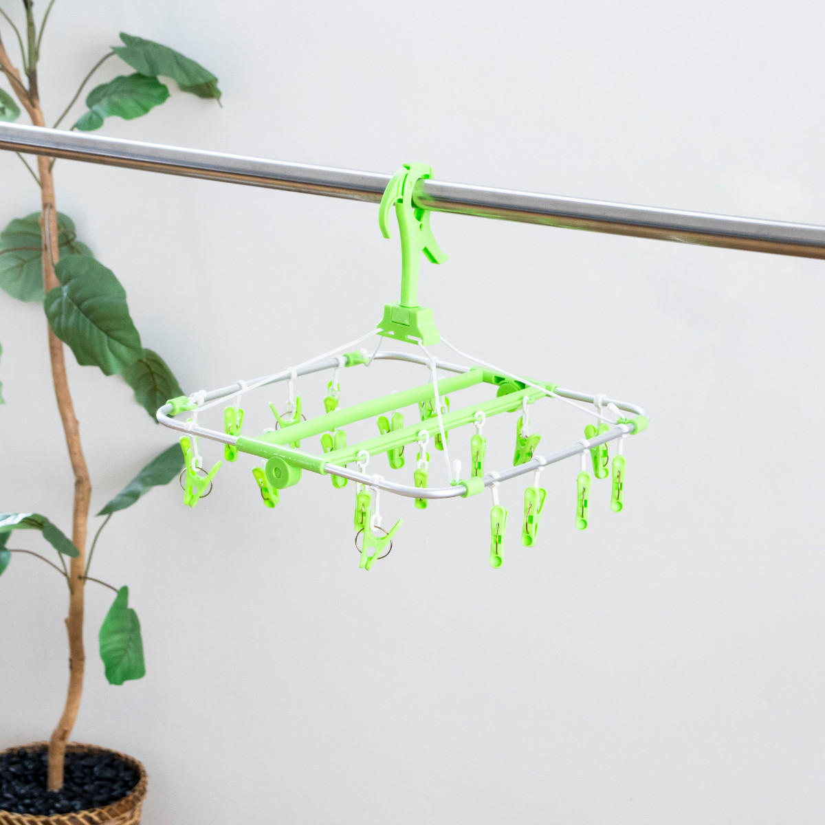 物干し竿にガッチリと固定できるキャッチフック式です。また、洗濯ロープやカモイにも使えるので活躍シーンがぐっと広がります。