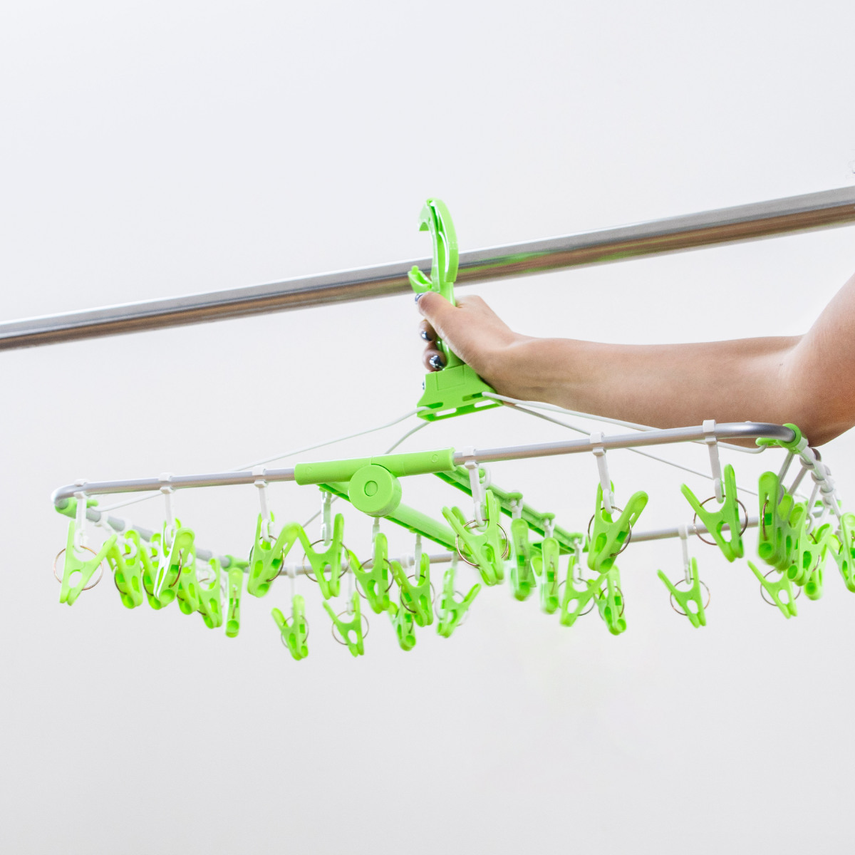 急な降雨時などに洗濯物を取り込みやすい下折れ式です。洗濯物を干したまま一気にサッと取り込めて時短になります。また、使わない時は折り畳んでコンパクトになります。