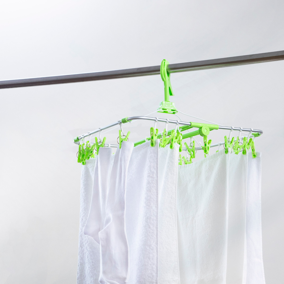 ピンチが30個付いたアルミフレームの角ハンガーです。一度にまとめて干せるので、共働き・忙しい家庭の方におすすめのサイズです。アルミ製なので軽量で持ち運びも便利です。