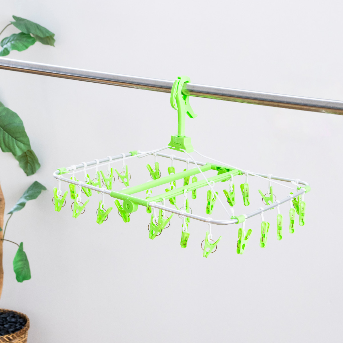物干し竿にガッチリと固定できるキャッチフック式です。また、洗濯ロープやカモイにも使えるので活躍シーンがぐっと広がります。