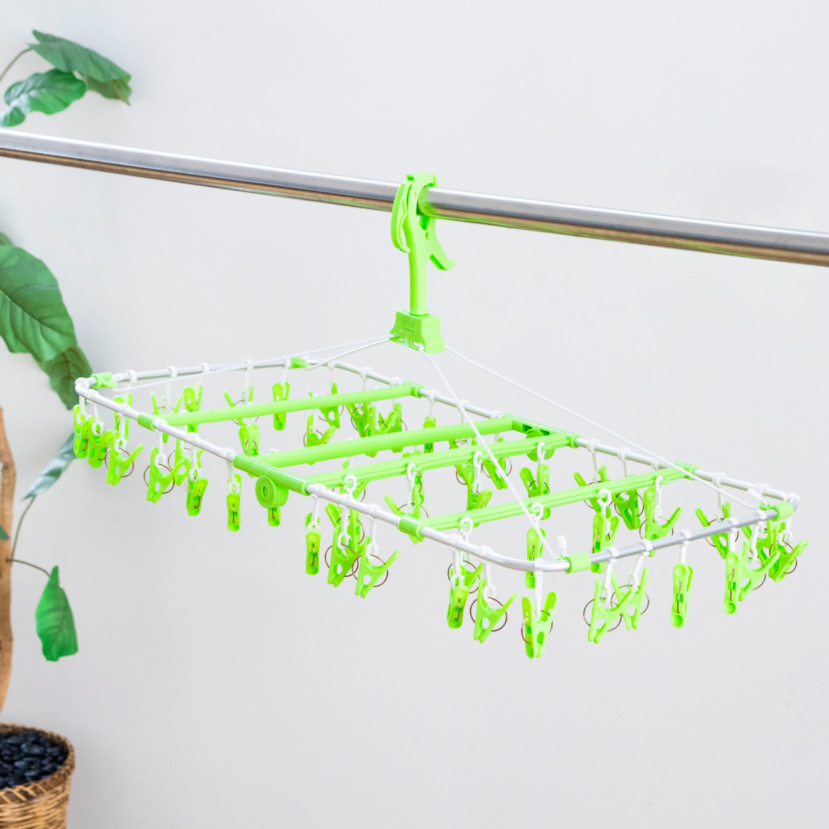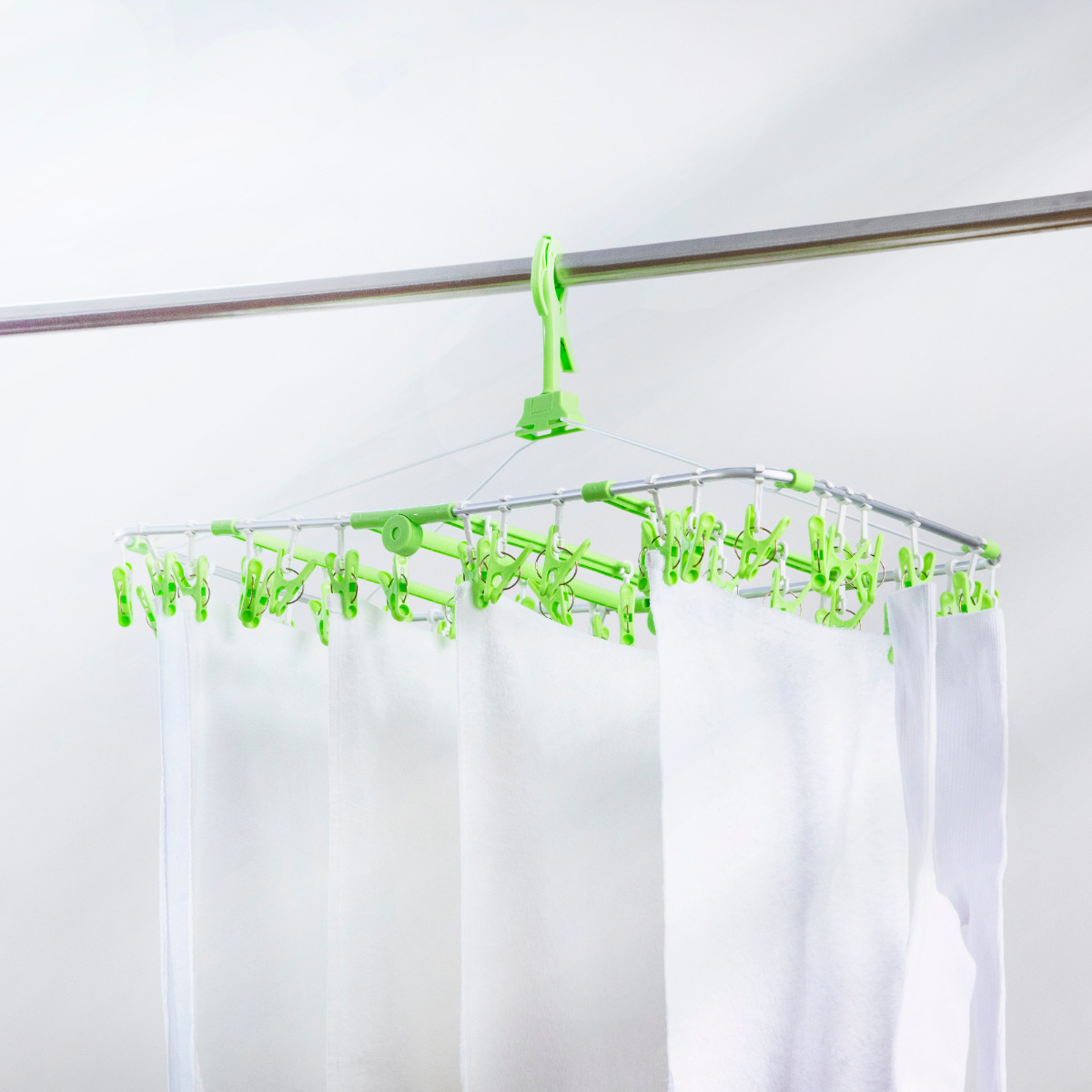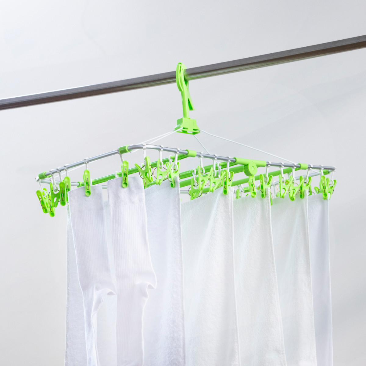 物干し竿にガッチリと固定できるキャッチフック式です。また、洗濯ロープやカモイにも使えるので活躍シーンがぐっと広がります。