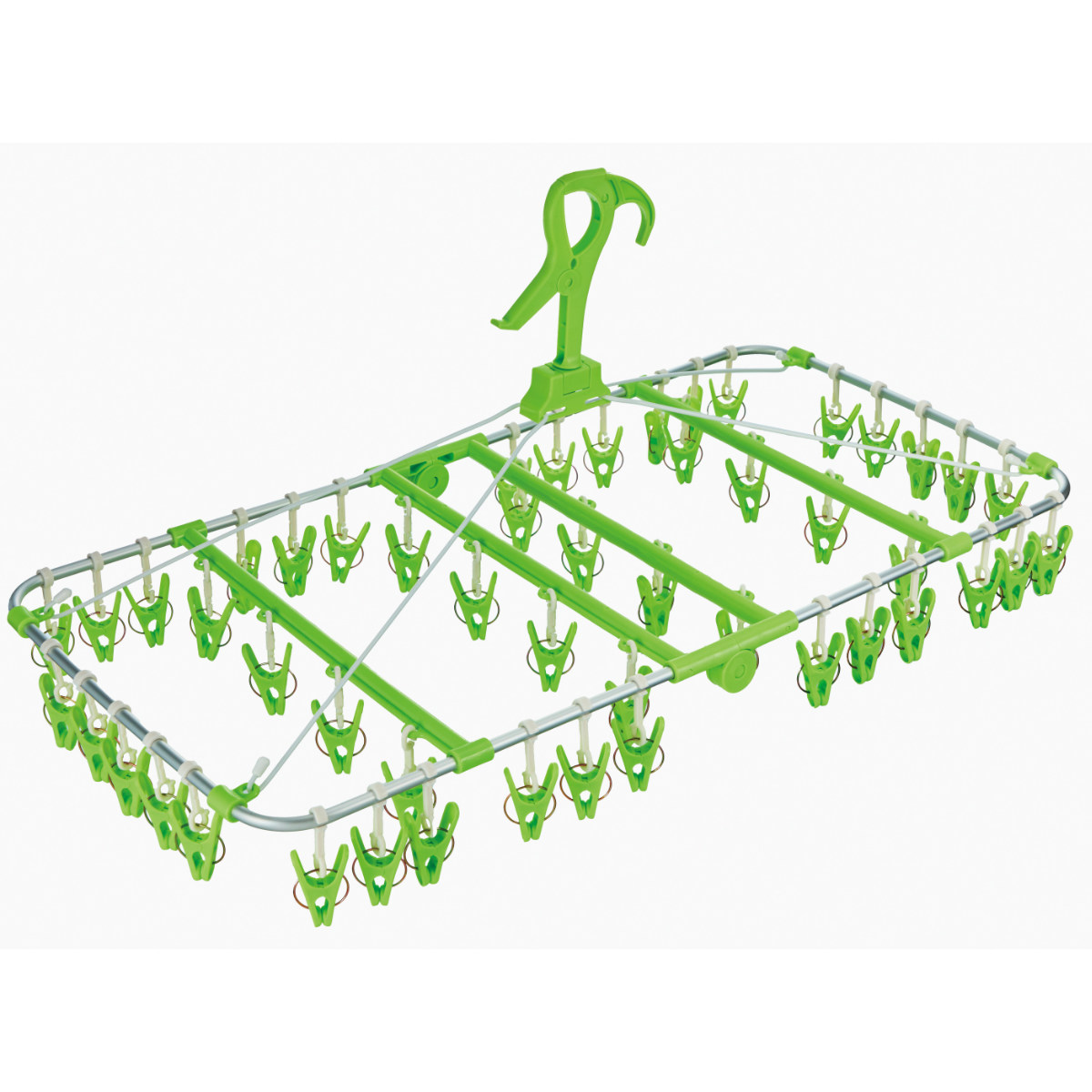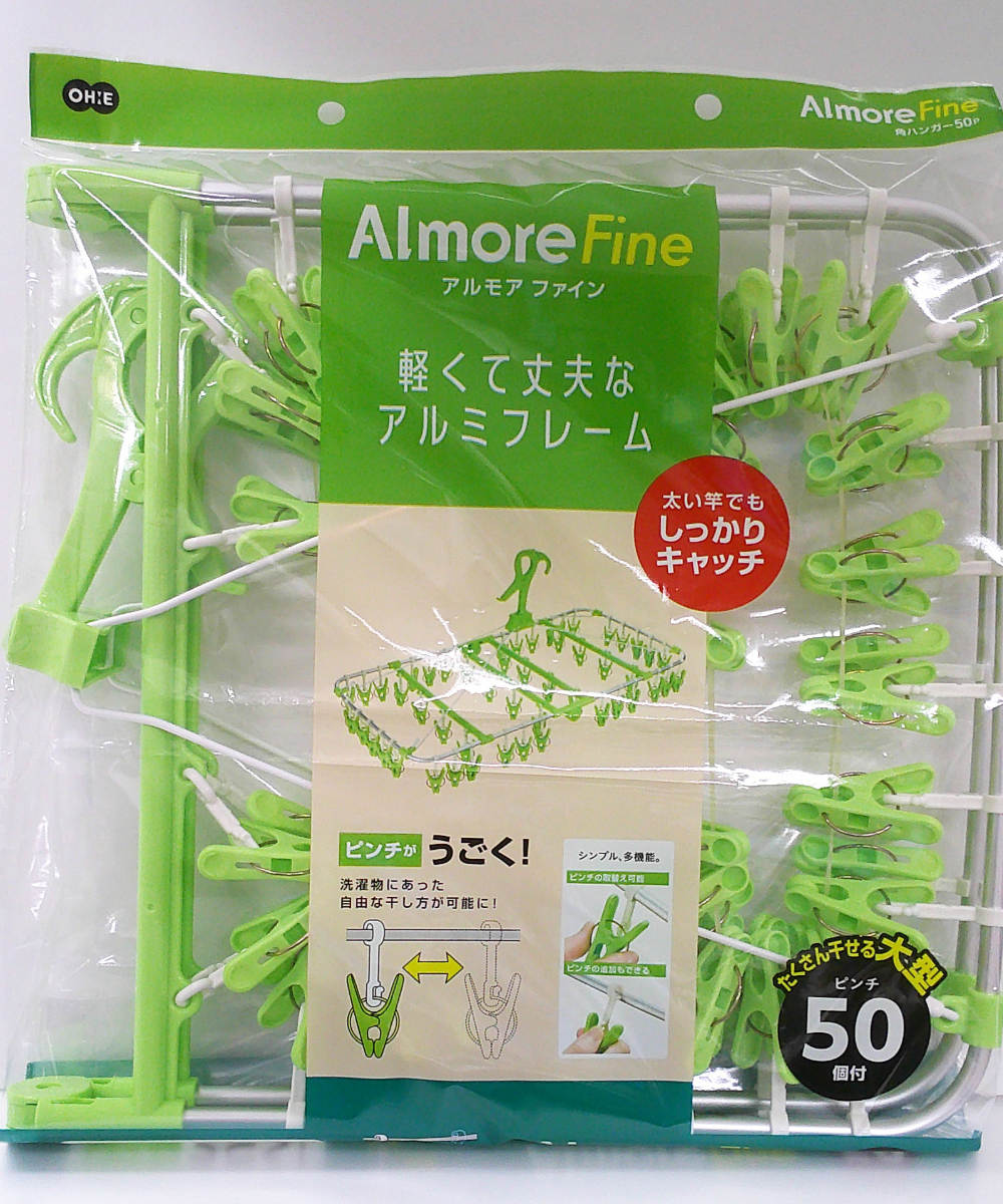 ピンチが50個付いたアルミフレームの角ハンガーです。大家族や洗濯物が多いご家庭におすすめの大容量サイズです。アルミ製なので軽量で持ち運びも便利です。