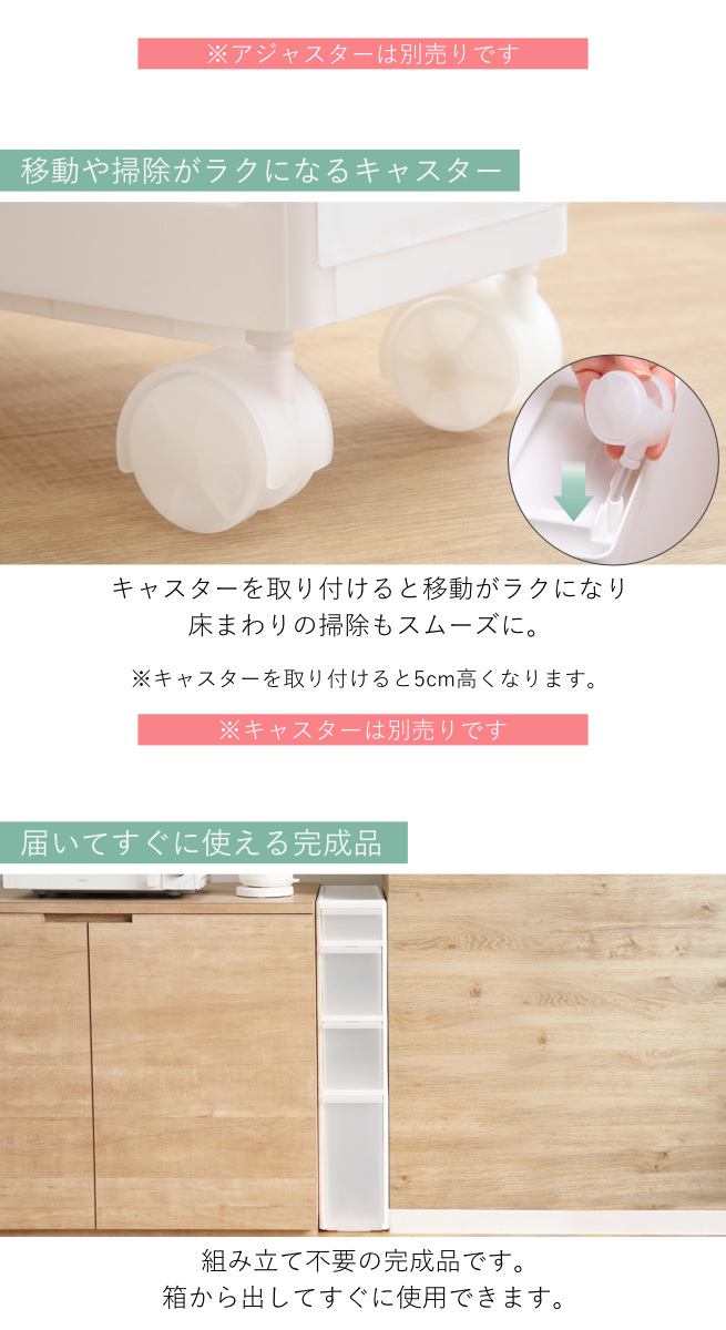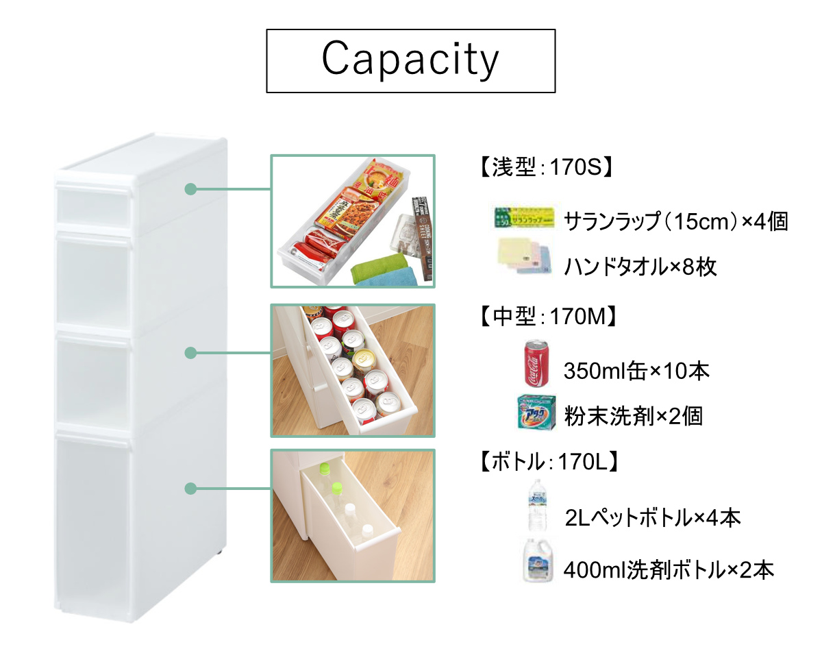 | 引き出し1段あたり耐荷重 | 浅型:約 2.5kg 中型:約 5kg ボトル:約 10kg |