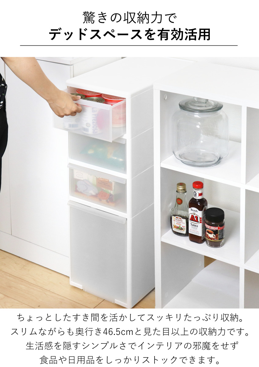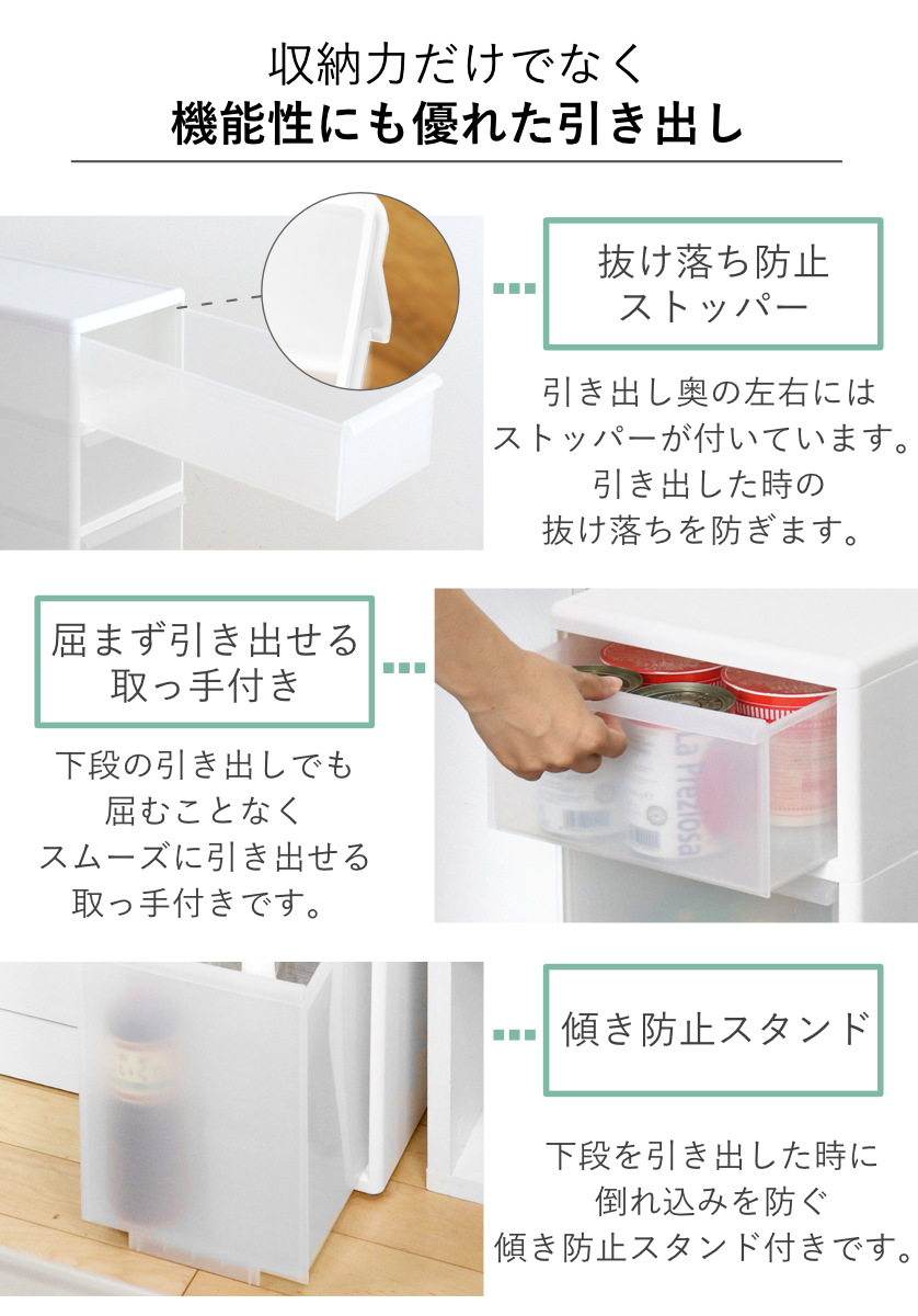 | 引き出し1段あたり耐荷重 | 浅型:約 5kg ボトル:約 14kg |