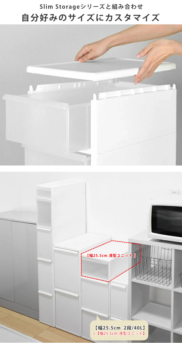 追加で段数を増やしたい方は、連結ユニットを組み合わせて、自由にカスタマイズができます。引き出しの色はホワイトと半透明、高さは4種類の中からお選びいただけます。