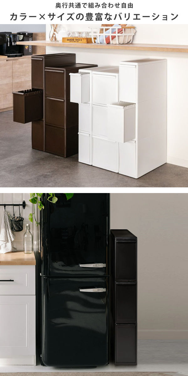 キッチンだけでなく、洗面台と洗濯機の間などでも使用可能で、ゴミ袋・洗剤・食品・ペットボトルなどの収納にもおすすめです。