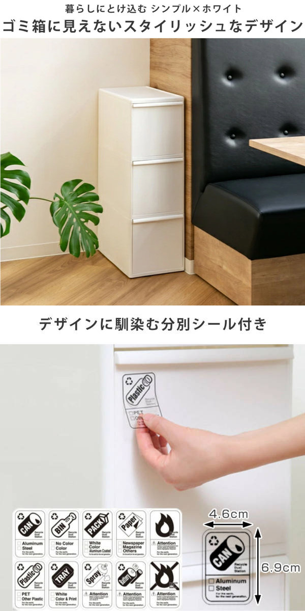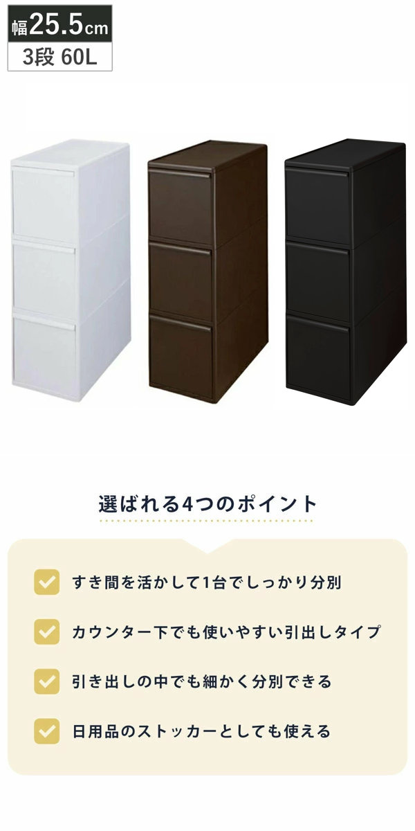 冷蔵庫や食器棚の横にあるちょっとした隙間にも収まる幅25.5cmのゴミ箱です。縦型のゴミ箱なので、キッチンのデッドスペースを有効活用して、1台でしっかり分別ができます。