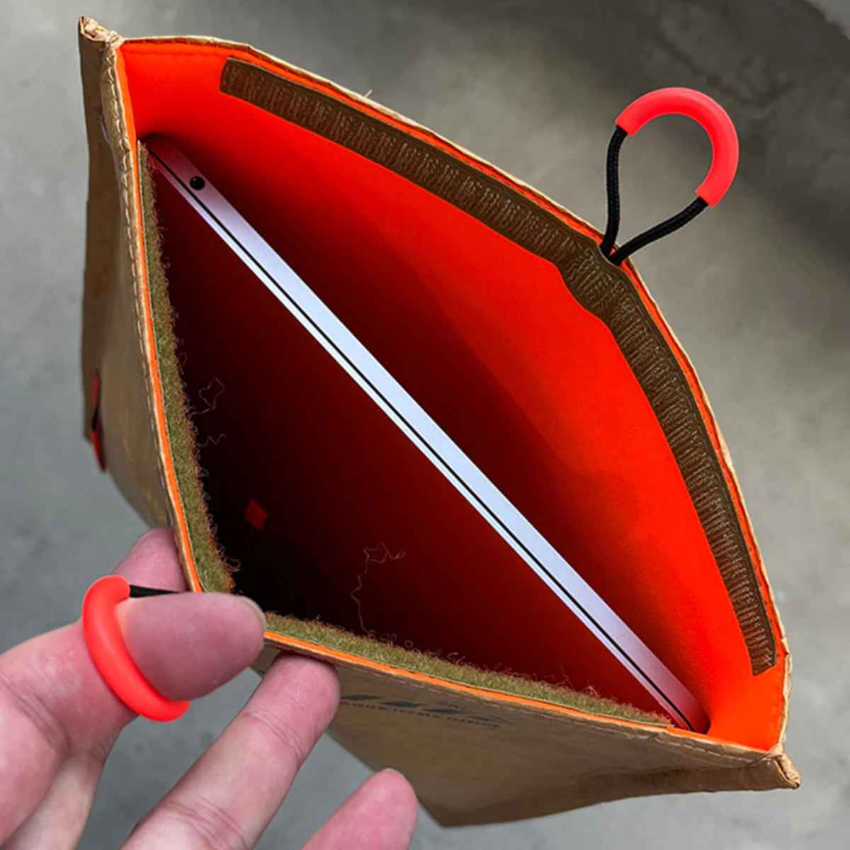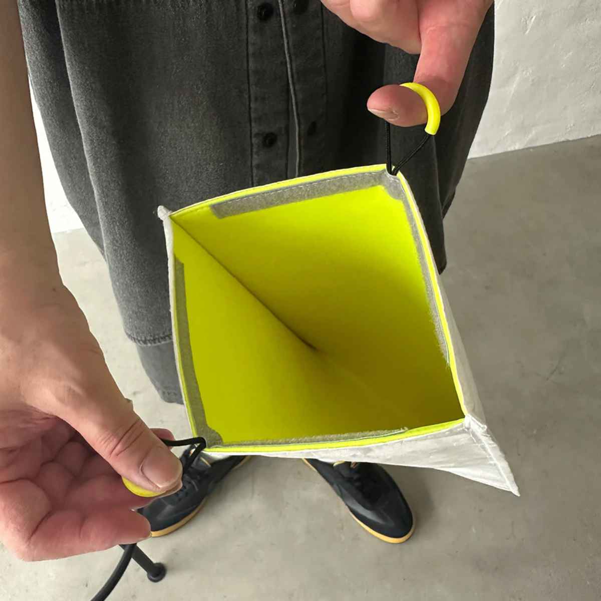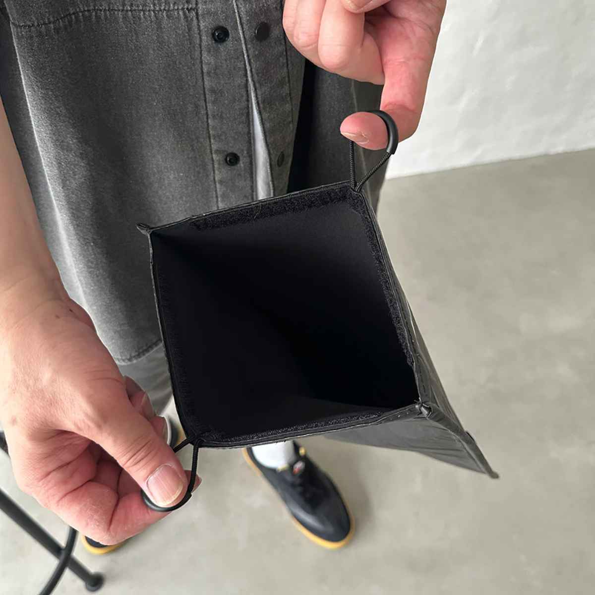 面ファスナー式で、持ち手に指を通して引くとサッと開けられます。開閉がスムーズで中身の出し入れも簡単です。