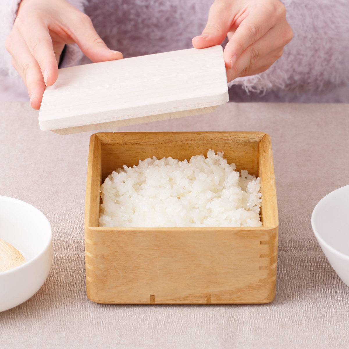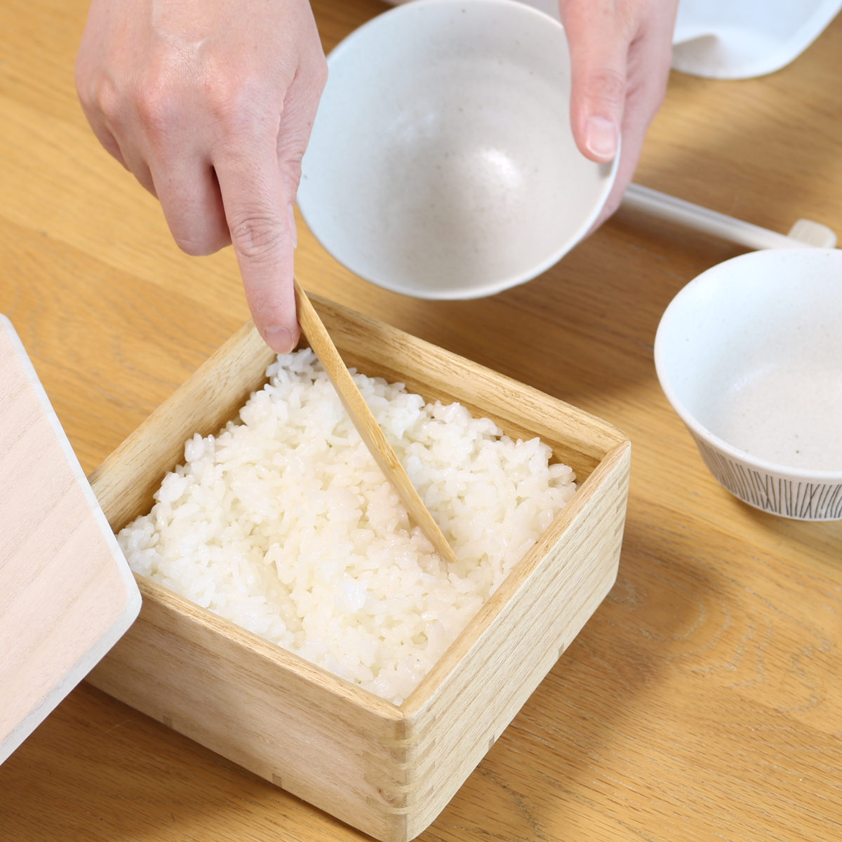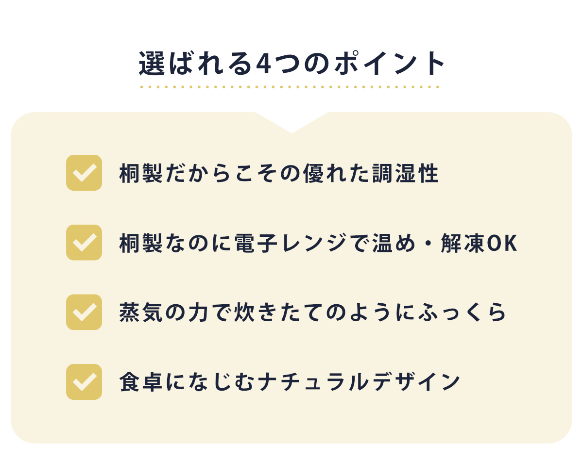 桐が持つ優れた調湿性により、炊きたてのご飯から出る余分な蒸気を吸収し、乾燥してくると水分を放出します。ご飯がベタつきにくく、ほどよい水分量を保つことで、いつでも美味しくいただけます。
