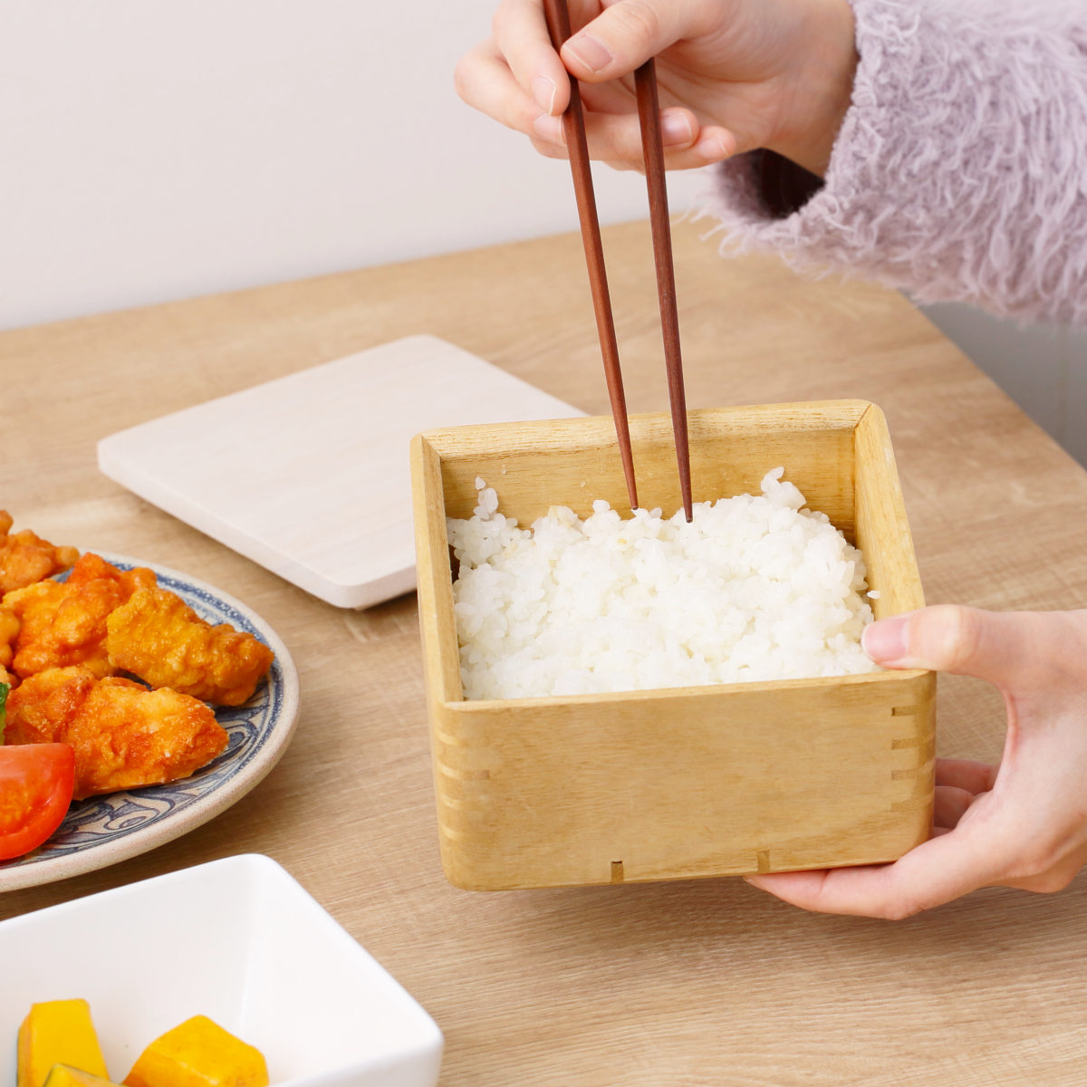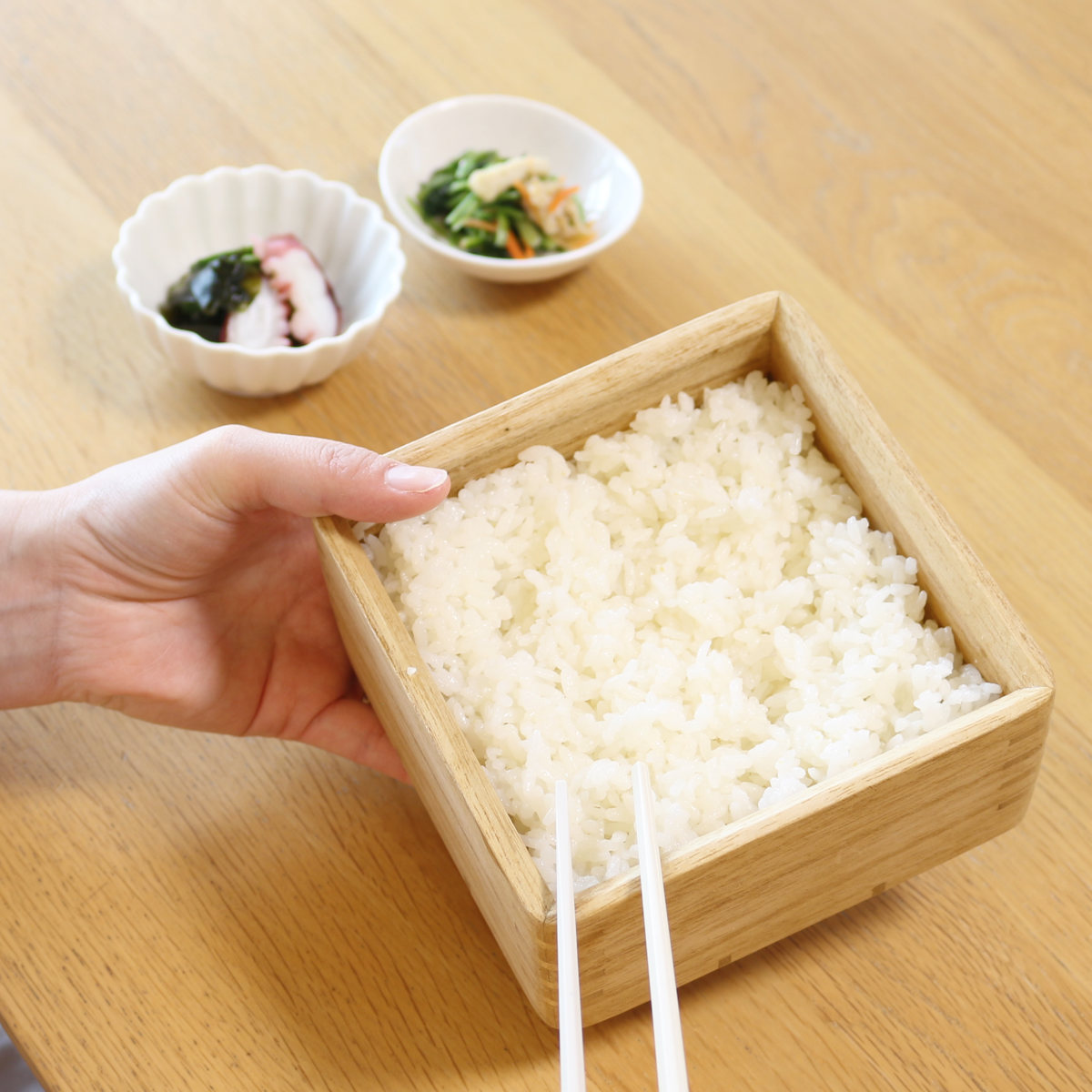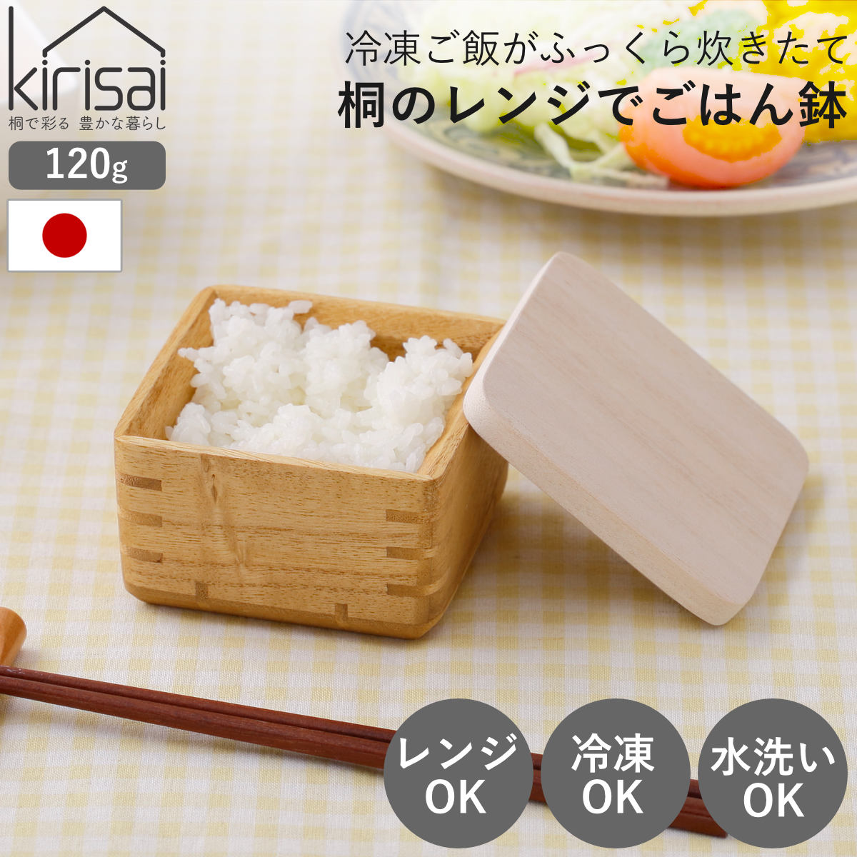 木製容器は電子レンジに不向きという印象がありますが、kirisaiのごはん鉢は容器・フタともに電子レンジに対応。冷蔵・冷凍保存したご飯も、そのまま手軽に温め直して食卓に並べることができます。