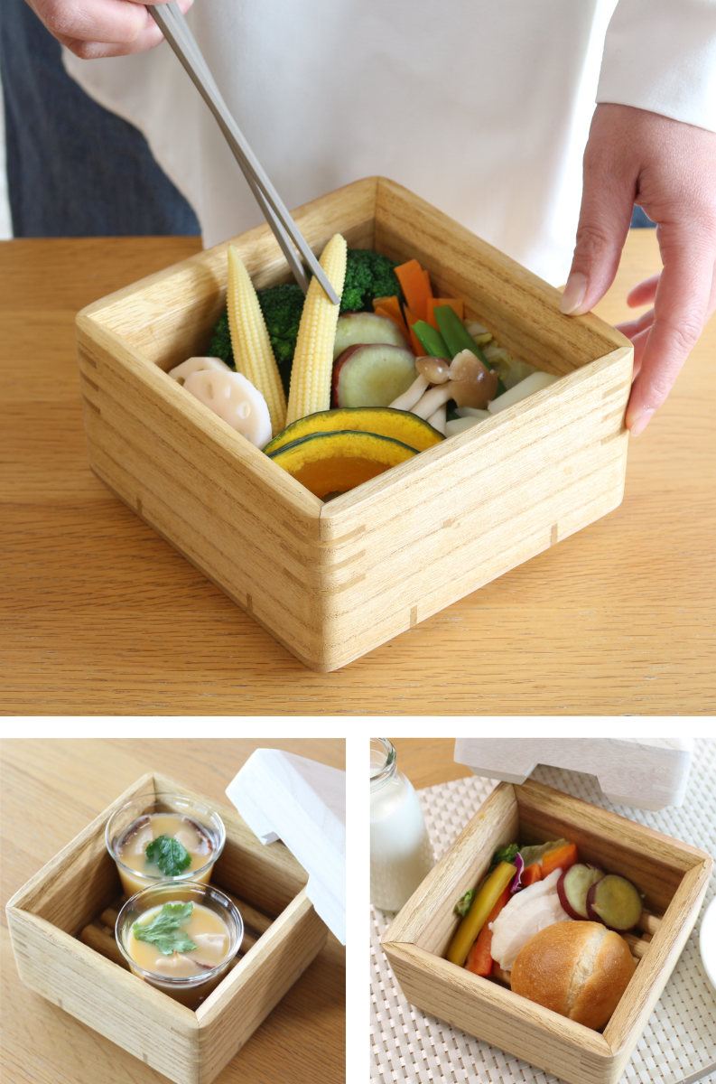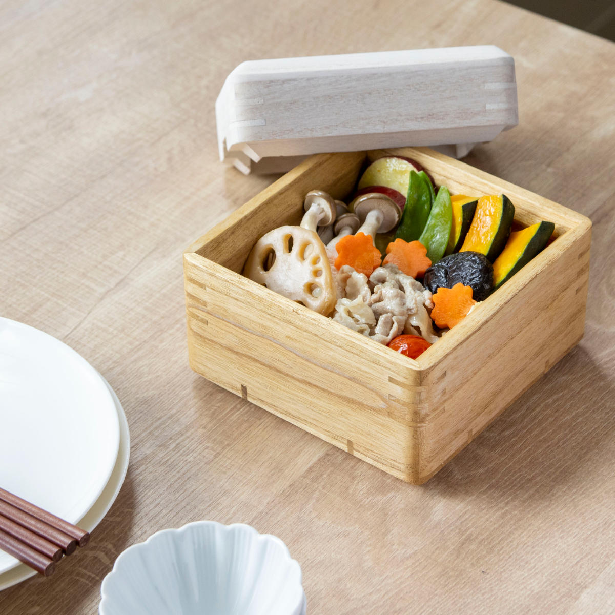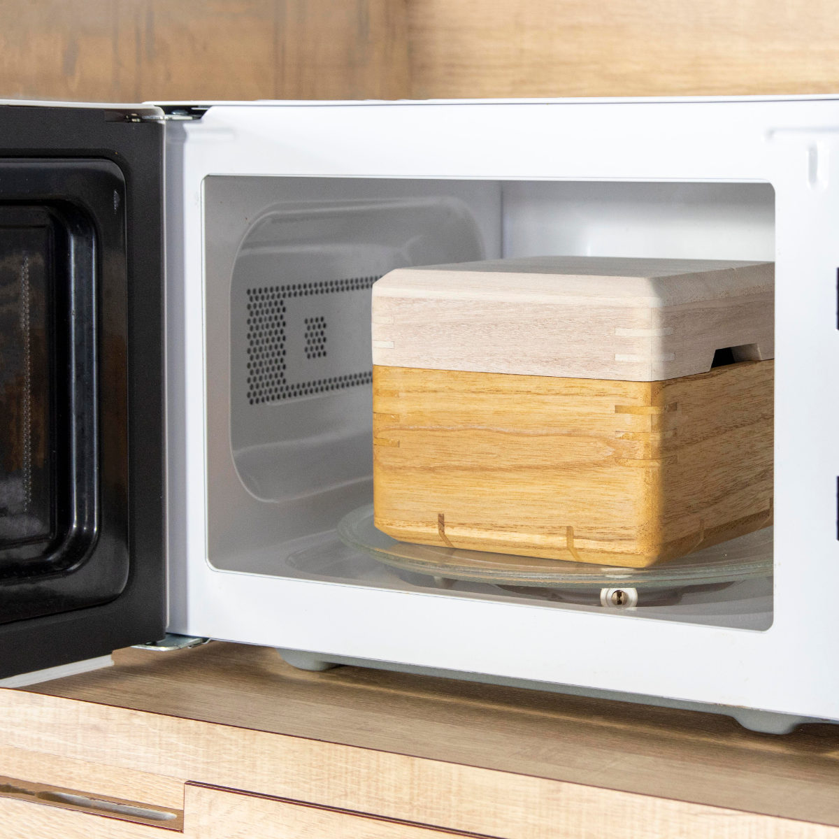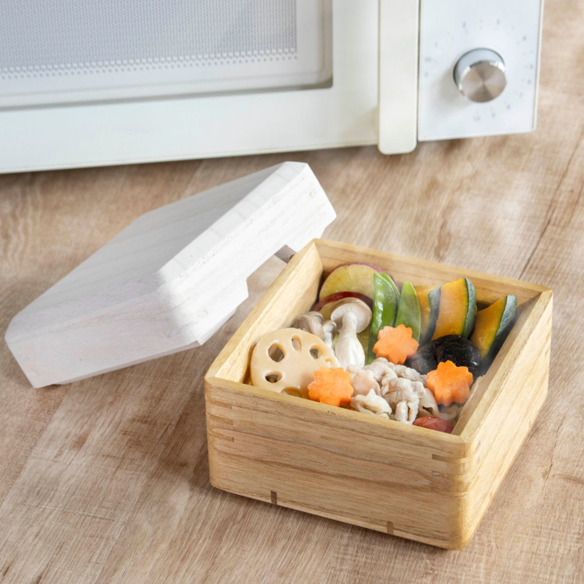 できあがったらそのまま食卓へ。白木の風合いを生かしたナチュラルなデザインは、食卓に心地よく馴染んで上質感を演出します。熱伝導率の低い桐製なので、本体自体は熱くなりにくく、チンしてすぐに取り出せるのも嬉しいポイント。
