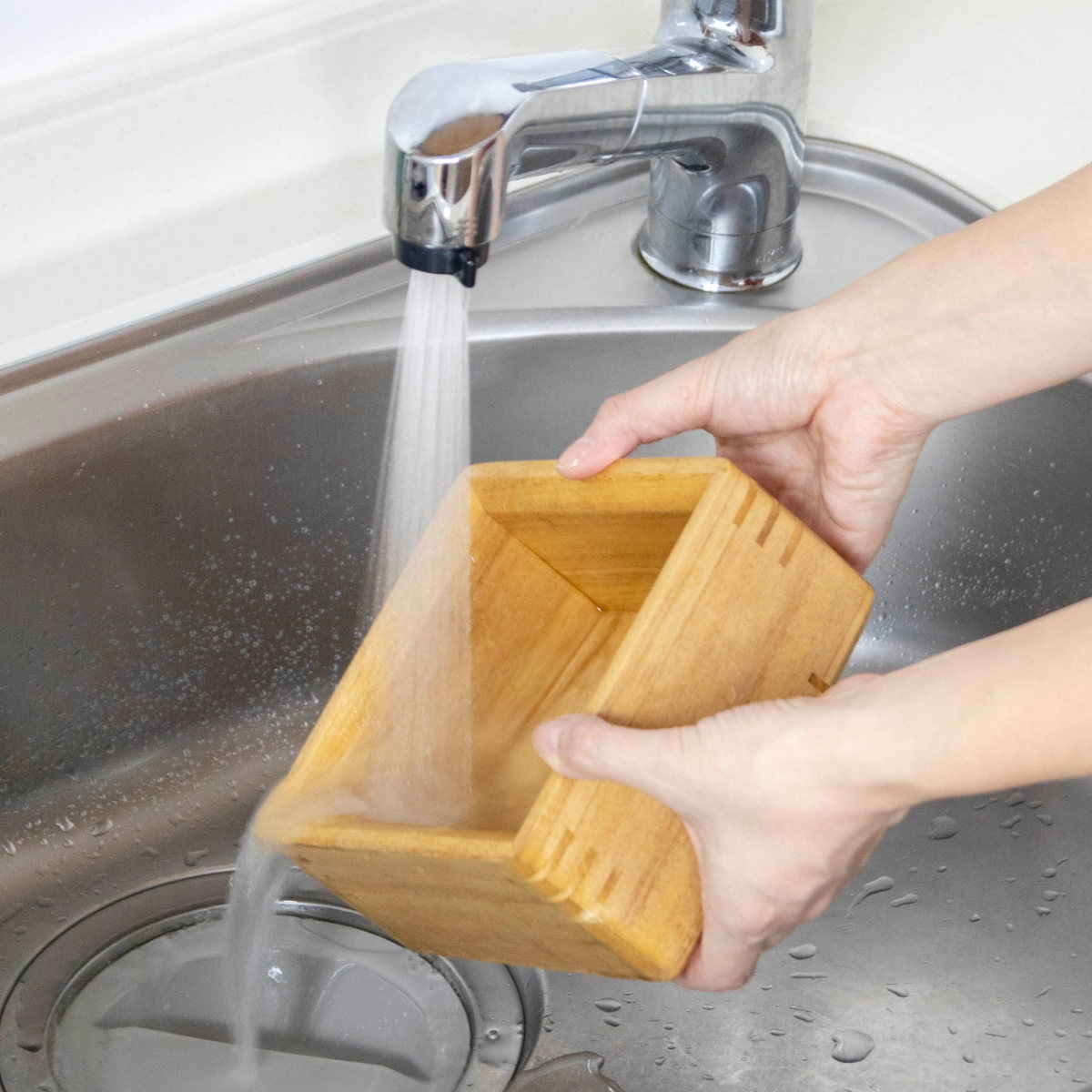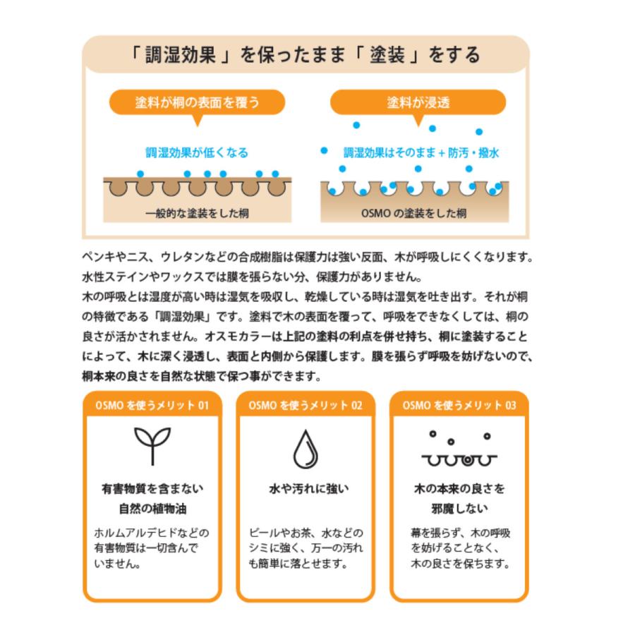 木材保護塗装「OSMO」で仕上げているため、桐素材でも水洗いが可能です。天然の抗菌性、防腐・防虫効果があるので、衛生面も安心。乾きも速く、お手入れにも手間がかかりません。