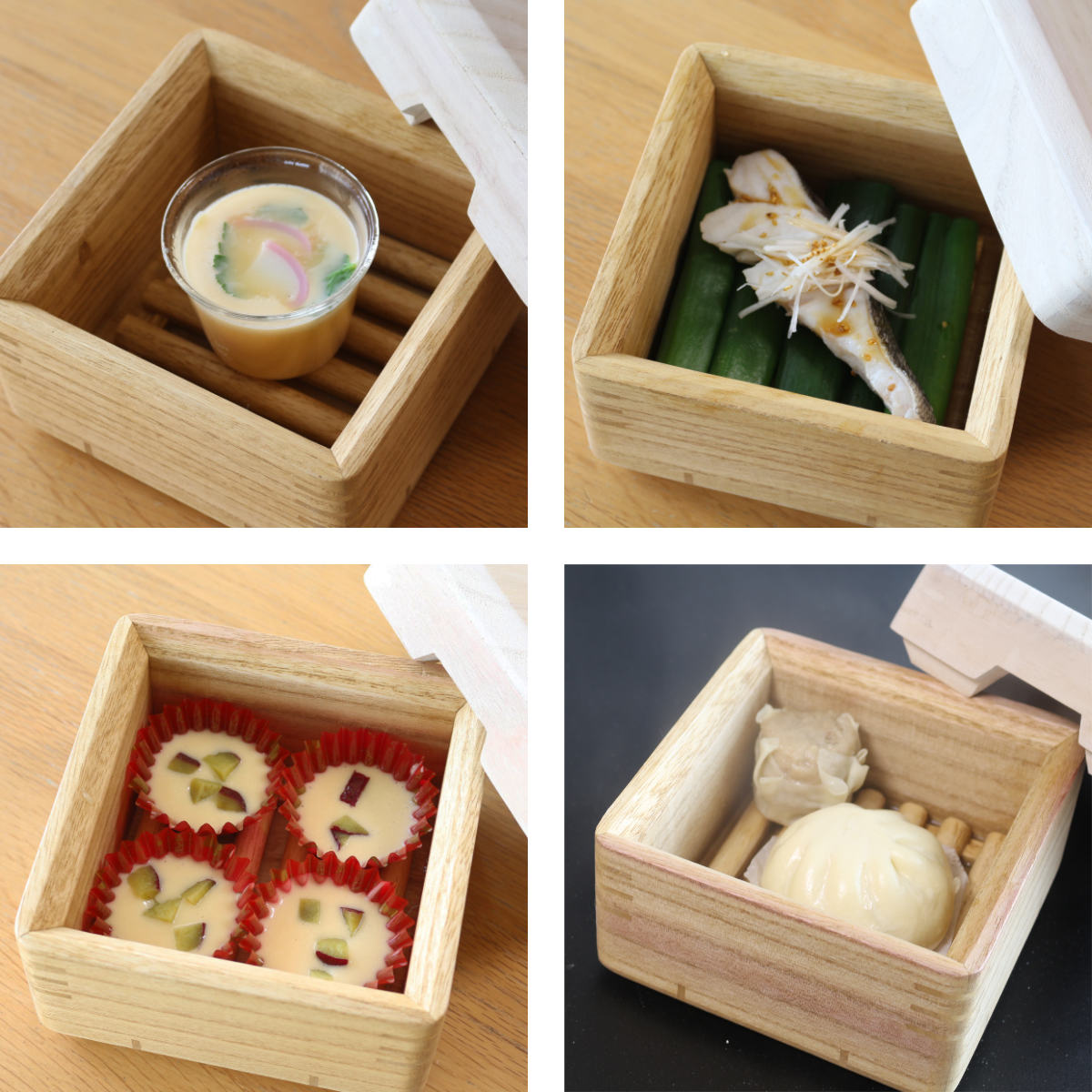ふっくらと仕上がったお肉やお魚、あるとうれしい茶碗蒸、プリンや蒸しケーキといったスイーツまで、様々なお料理が作れます。油を使わない蒸し料理でおいしくヘルシーな食生活に。桐の香りを纏った本格的な味をお楽しみください。