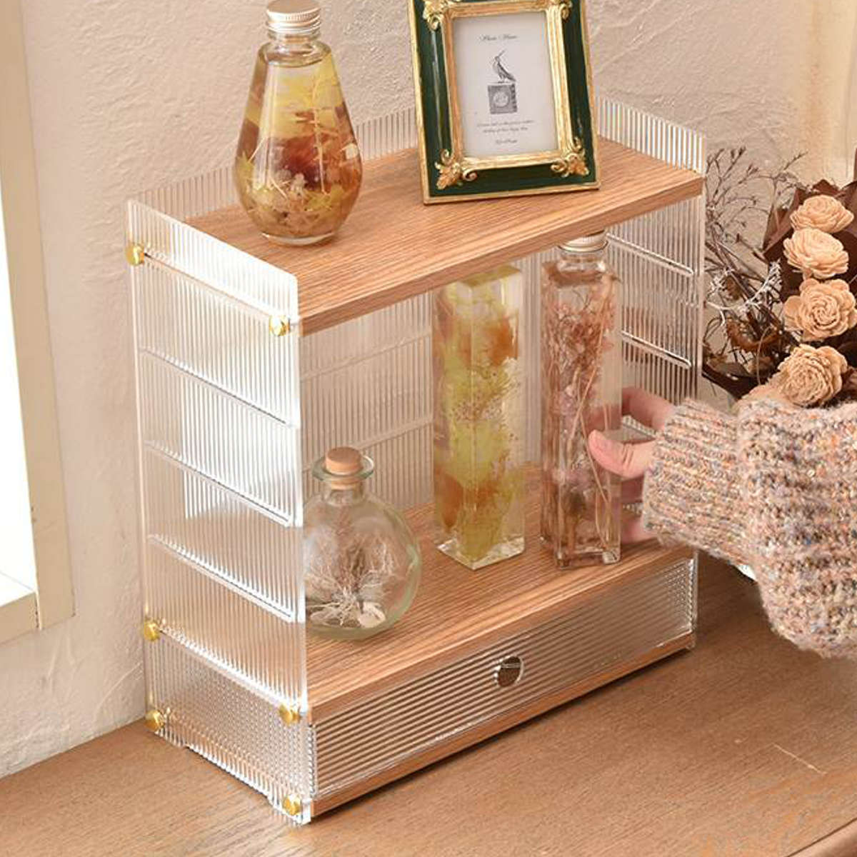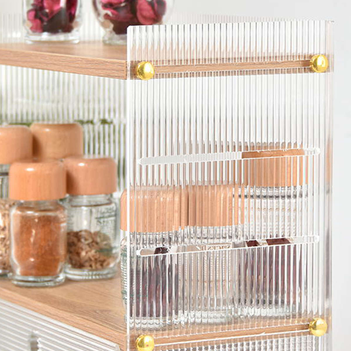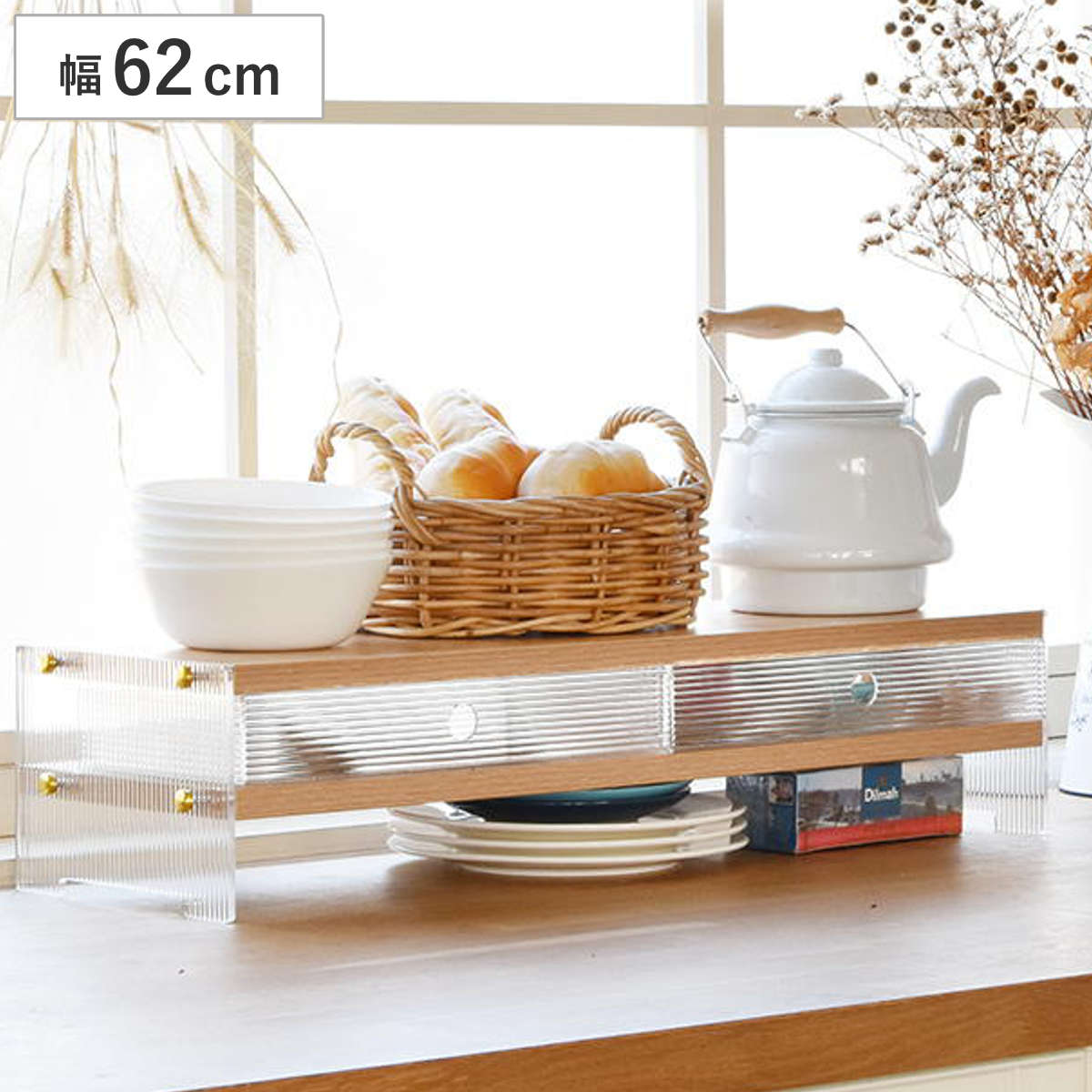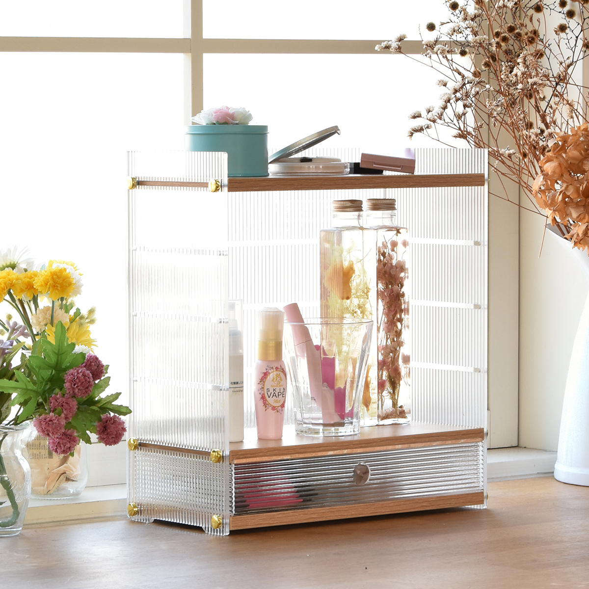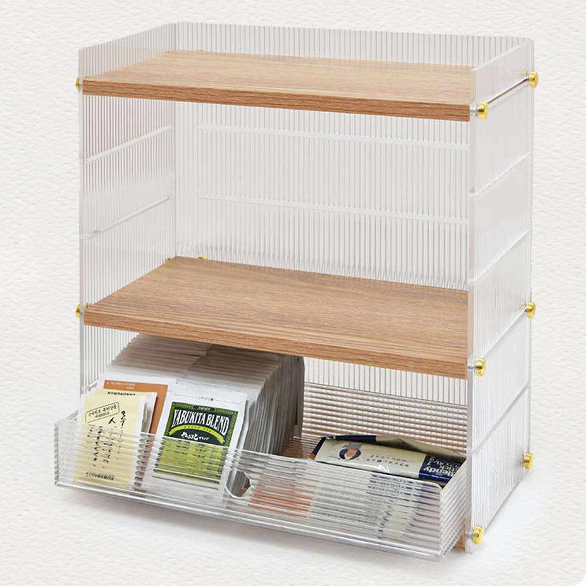 リブ加工できらめくアクリルと木目が美しい、ワイドタイプの収納棚です。ほどよい透け感と陰影が空間にやさしいゆらぎをもたらし、置くだけでインテリアに上質な美しさが生まれます。