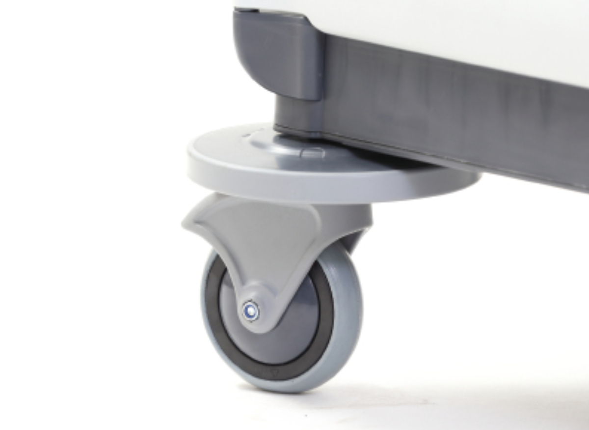 直径20cmの大口径バンパーを採用し、壁や什器に当たっても跡が残りにくいノーカーボンゴム素材で保護性を高めています。また、床に黒いゴム跡が残らないノーカーボンキャスターを搭載。環境基準値「AA地区 40dB」をクリアした静音仕様で、オフィス・病院・商業施設など静かな環境でも快適に使用できます。