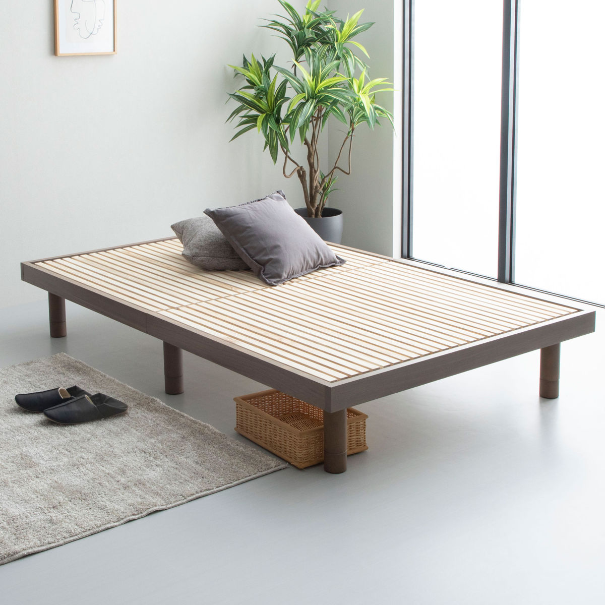 天然木の優しい風合いを感じられるすのこベッドです。床面は通気性・調湿性・防虫性に優れた天然桐すのこで、汗や湿気を溜め込まず、年中快適におやすみいただけます。高さも4段階で調整できるので、マットレスにも布団にも対応しています。