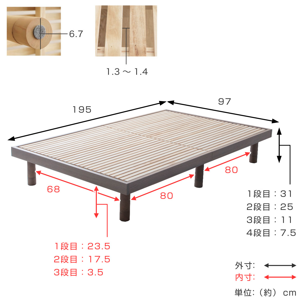 | サイズ | 約 横97×縦195(cm) 高さ:31・25・11・7.5cm 床板有効寸法:幅97cm×長さ195cm 床面高さ:31・25・11・7.5cm ベッド下間口:23.5・17.5・3.5cm |