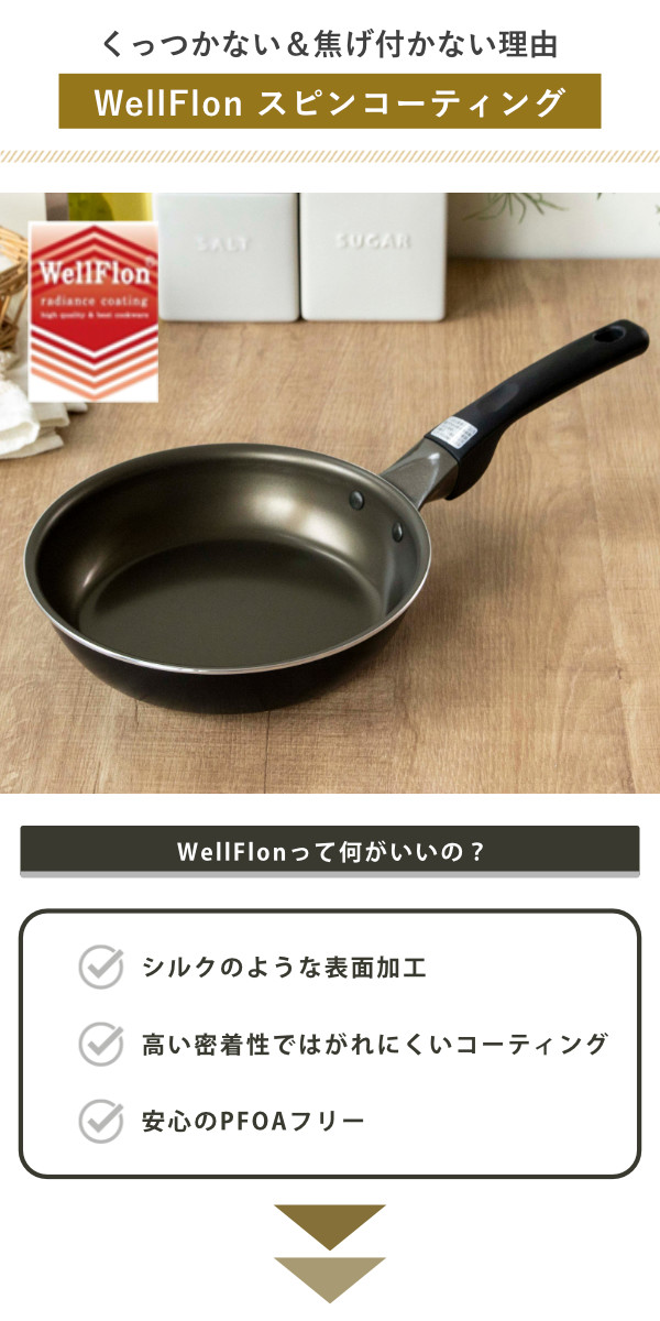 | 材質 | 本体:アルミニウム合金 底面:鉄・アルミニウム合金 内面加工:ふっ素樹脂塗膜加工(WellFlonスピンコーティング) 外面加工:セラミックコーティング加工 取っ手:フェノール樹脂 |