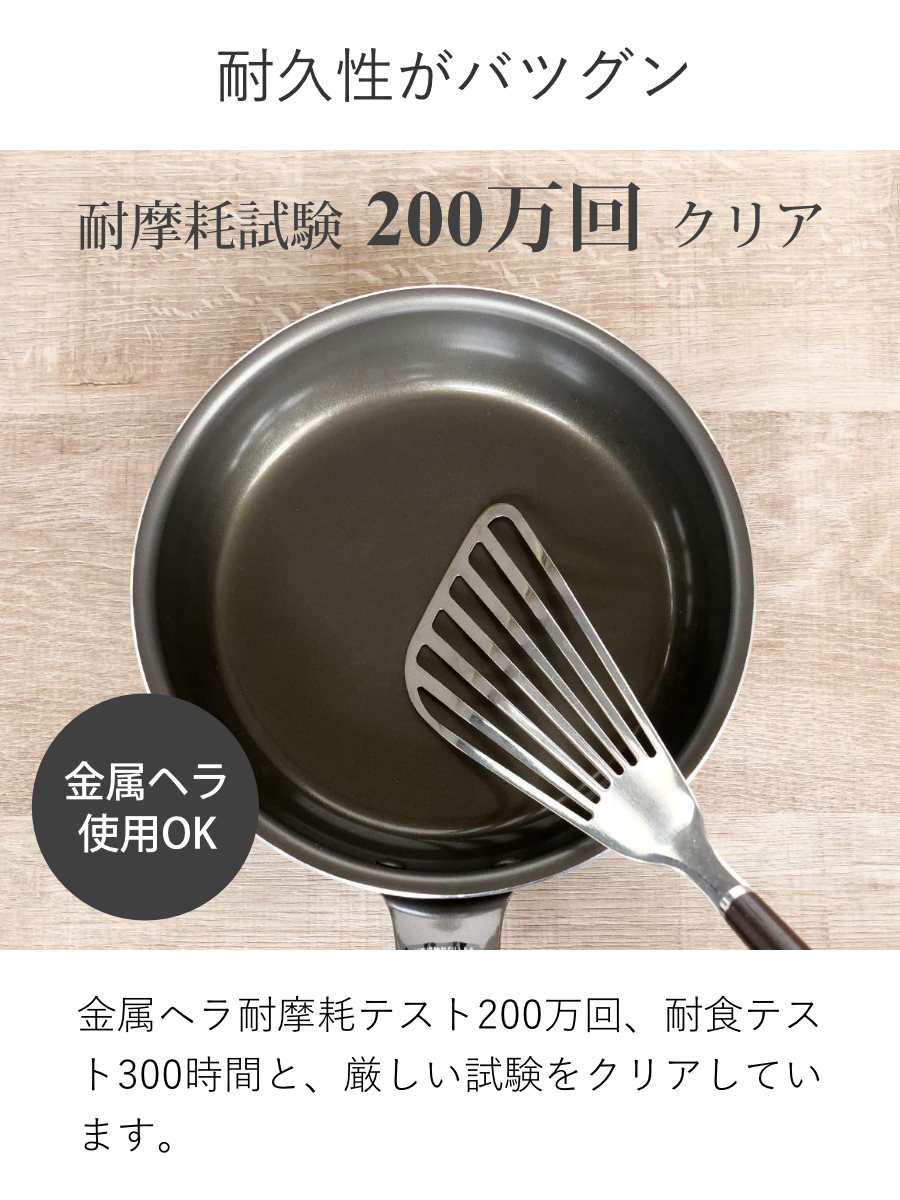 アルマイト加工がアンカー構造になっていて、アルミとコーティングの密着性が非常に高いです。調理中に油などが入り込まないので、コーティングがはがれにくく長持ちします。