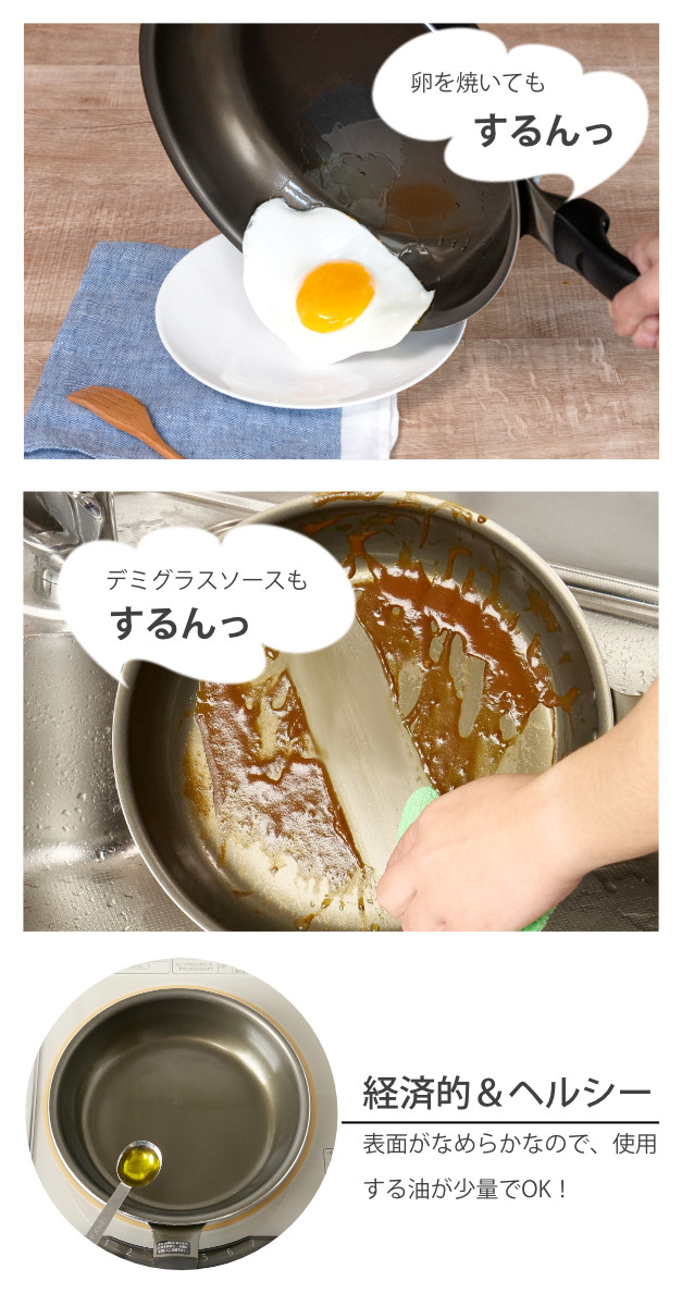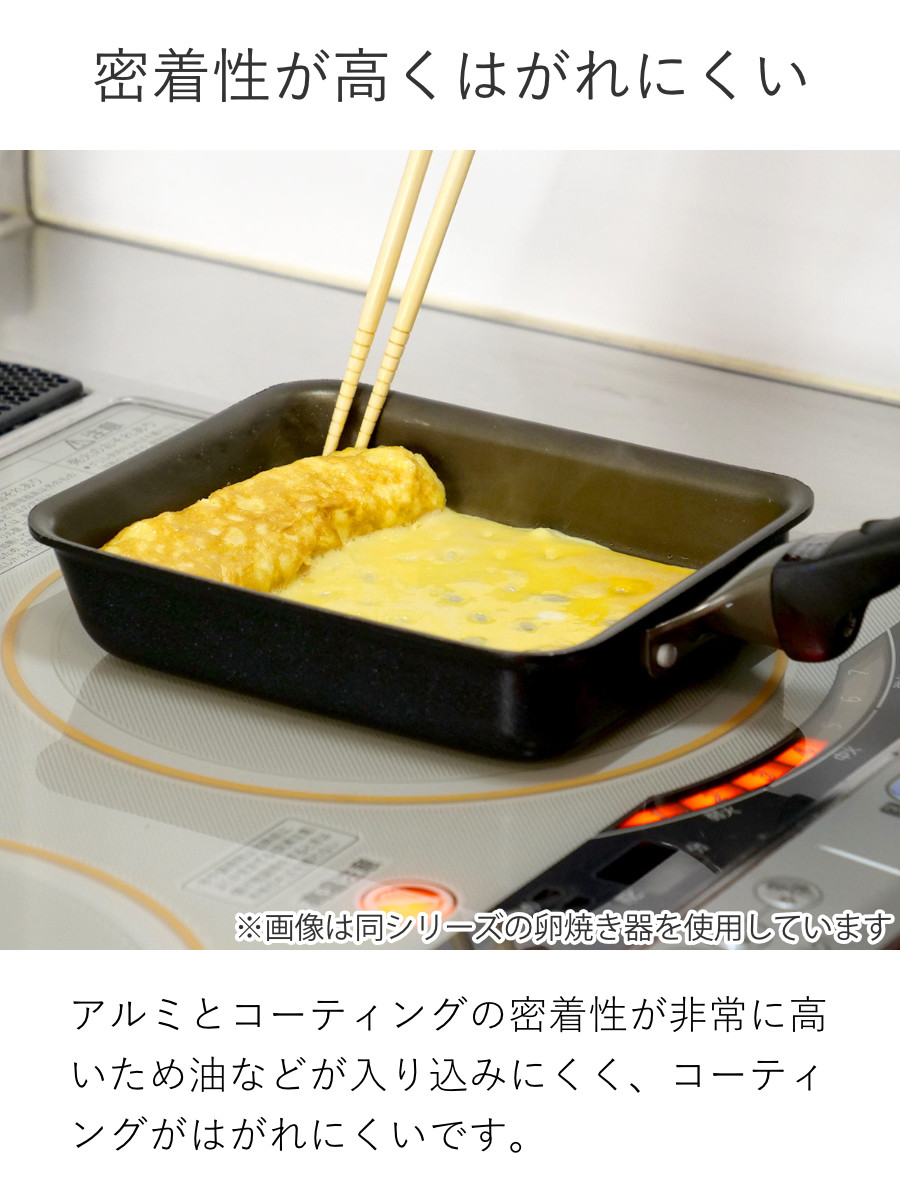アルマイト加工がアンカー構造になっていて、アルミとコーティングの密着性が非常に高いです。調理中に油などが入り込まないので、コーティングがはがれにくく長持ちします。