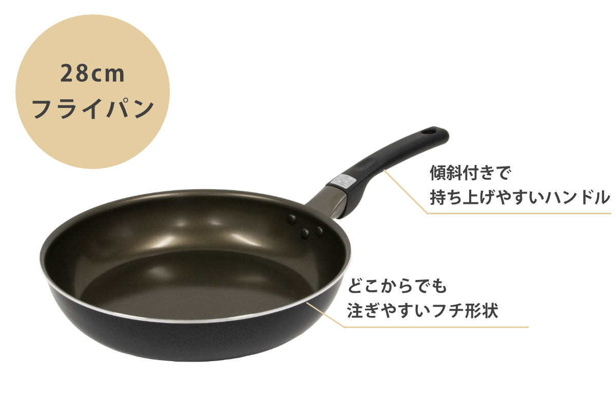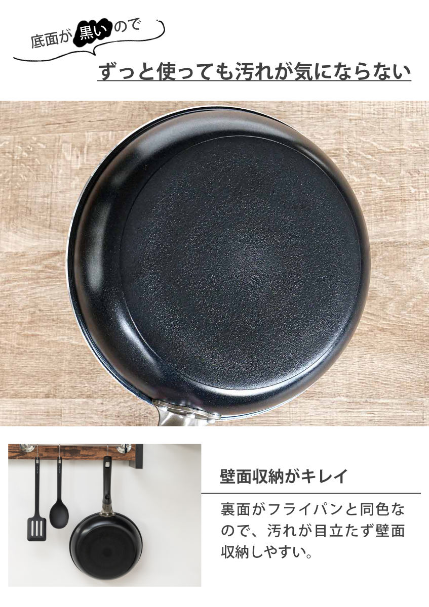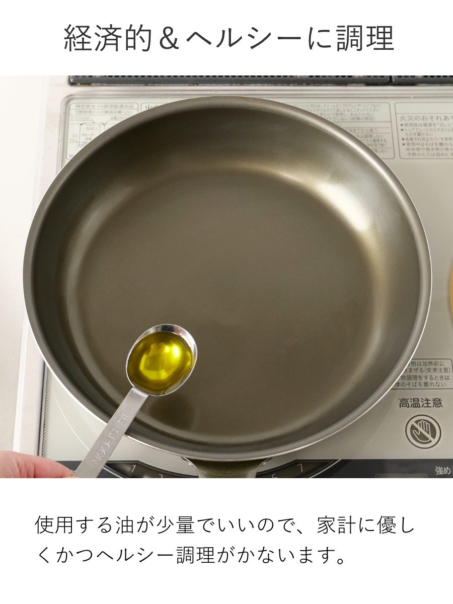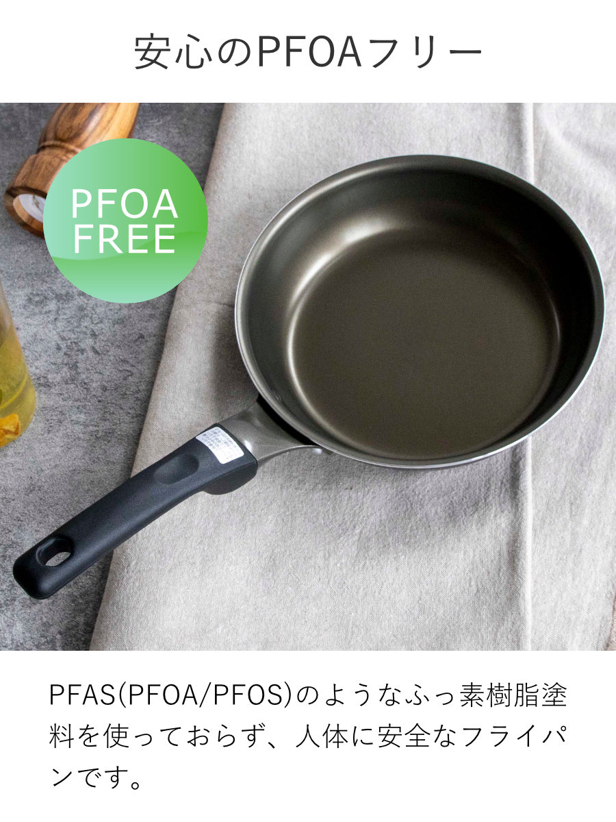 PFAS(PFOA/PFOS)のようなふっ素樹脂塗料を使っておらず、人体に安全なフライパンです。