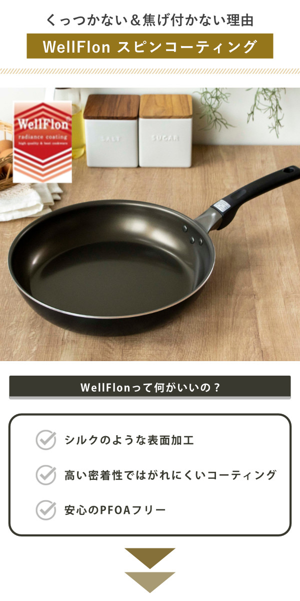 | 材質 | 本体:アルミニウム合金 底面:鉄・アルミニウム合金 内面加工:ふっ素樹脂塗膜加工(WellFlonスピンコーティング) 外面加工:セラミックコーティング加工 取っ手:フェノール樹脂 |