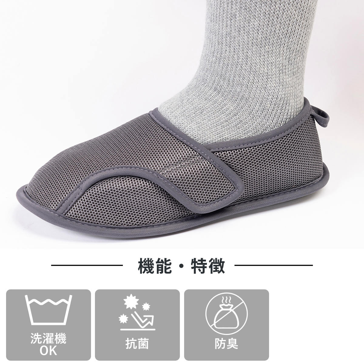 足腰が弱った方でも、なるべく楽に歩けるように軽い素材で作られています。(片方:Lサイズ 約125g)表地は通気性の良いメッシュ素材がムレを防ぎ、快適な履き心地です。中底には素足でも気持ちの良いパイル地を使用しています。