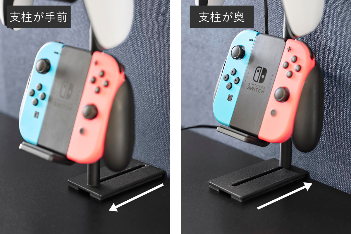 最上段にはヘッドセットを収納できます。支柱を手前にスライドすれば、壁に干渉せずにヘッドセットをスッキリ収納できます。