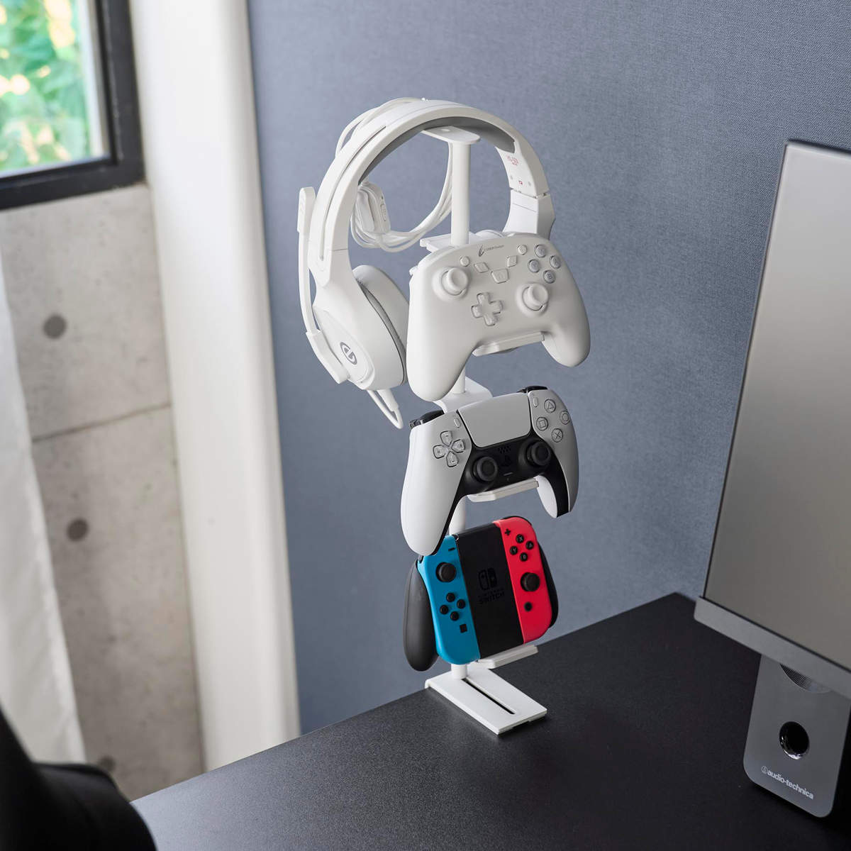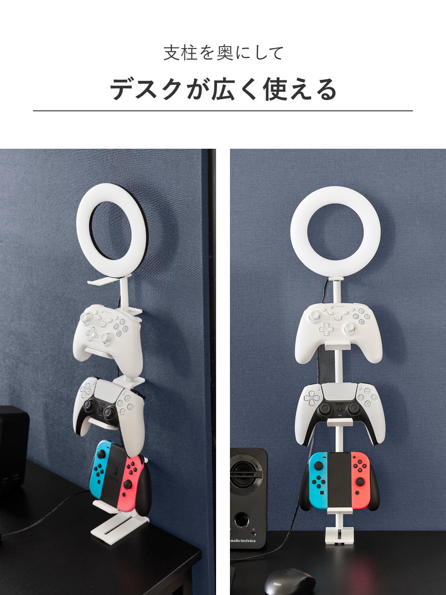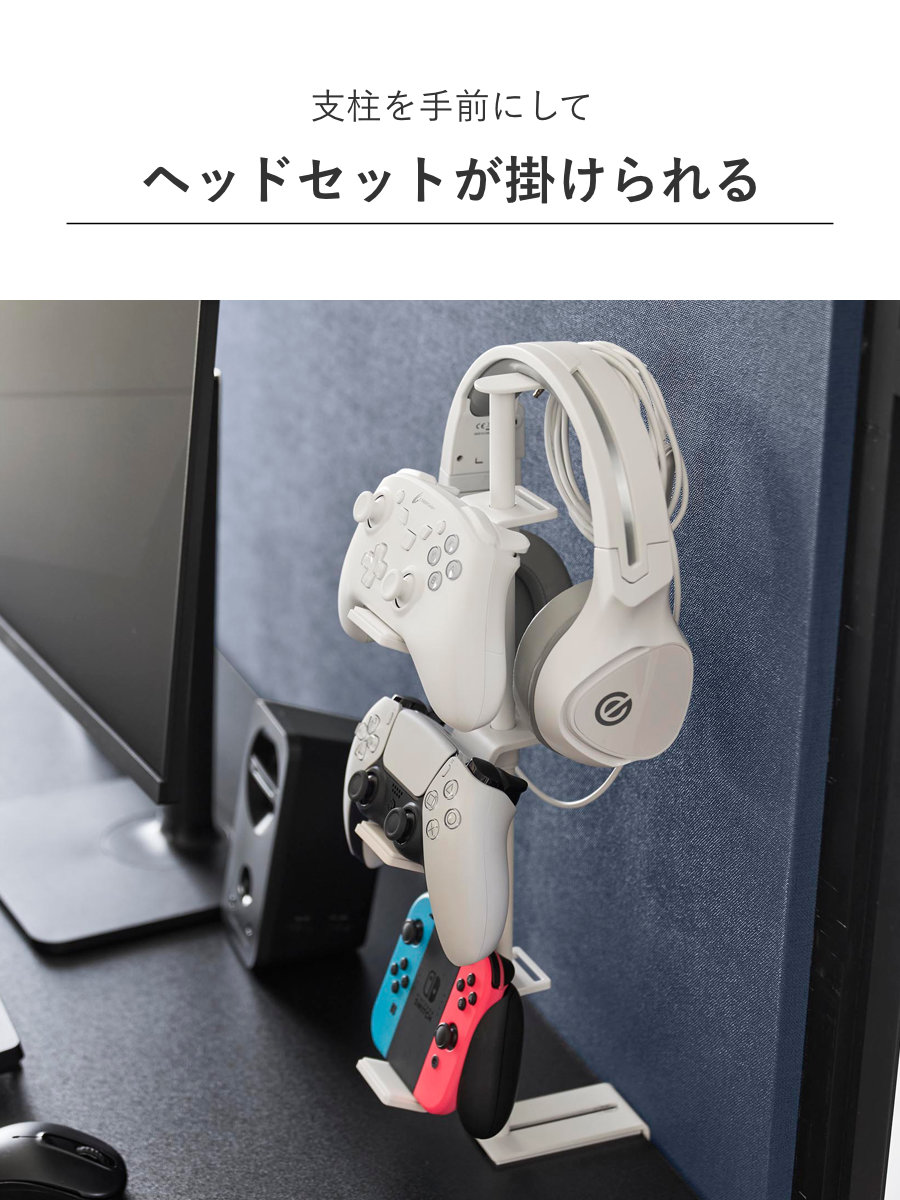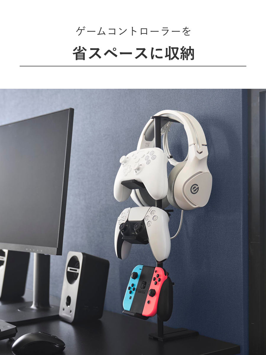 デスクの奥に2個の調節ネジでしっかり固定できるゲームコントローラーを省スペースに収納できるラックです。支柱はスライド式で、置く物に合わせて調整可能です。置き場所に困る形の異なるコントローラーやヘッドセットを引っ掛けるだけでまとめて収納できます。