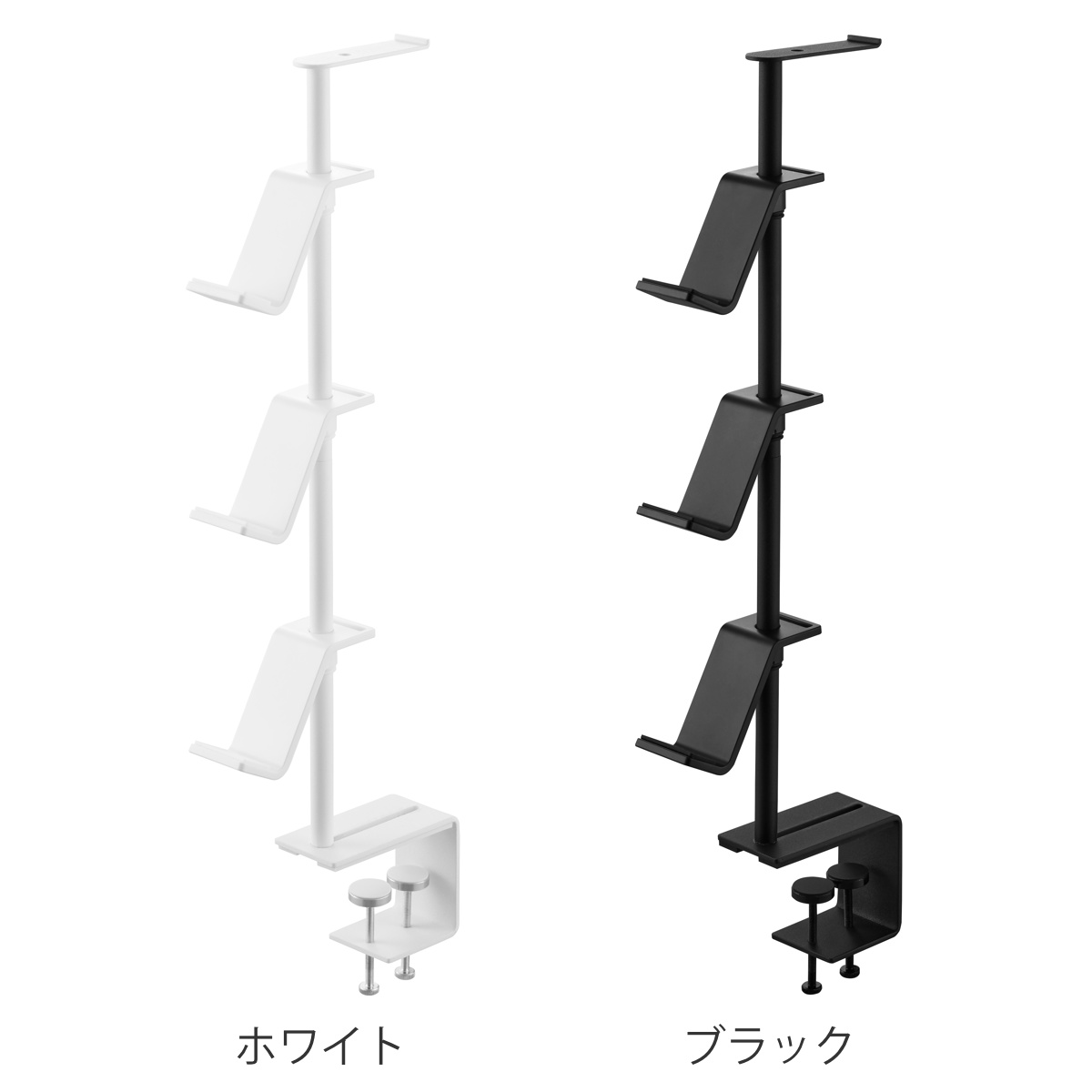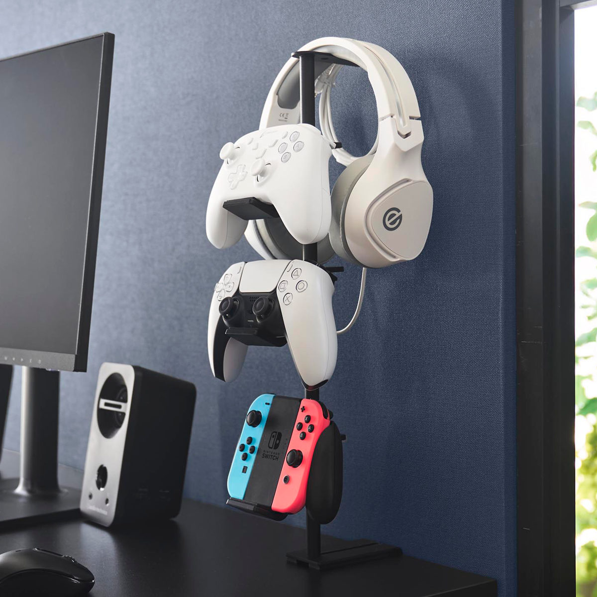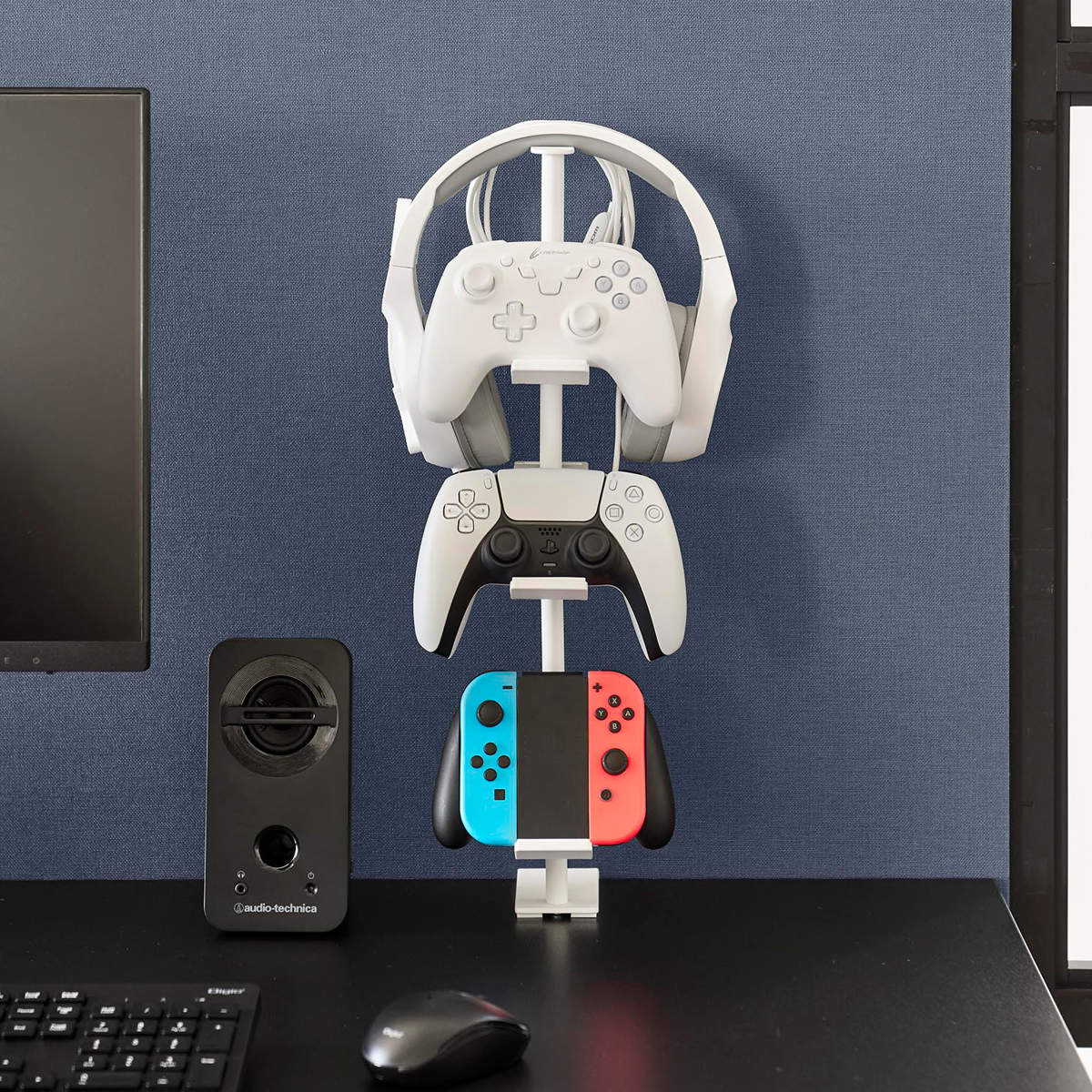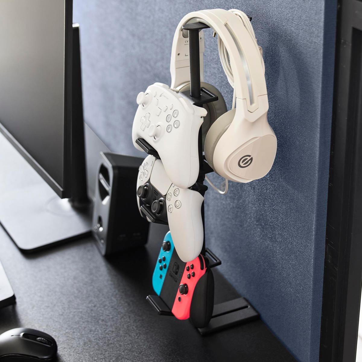 デスクの奥に2個の調節ネジでしっかり固定できるゲームコントローラーを省スペースに収納できるラックです。支柱はスライド式で、置く物に合わせて調整可能です。置き場所に困る形の異なるコントローラーやヘッドセットを引っ掛けるだけでまとめて収納できます。