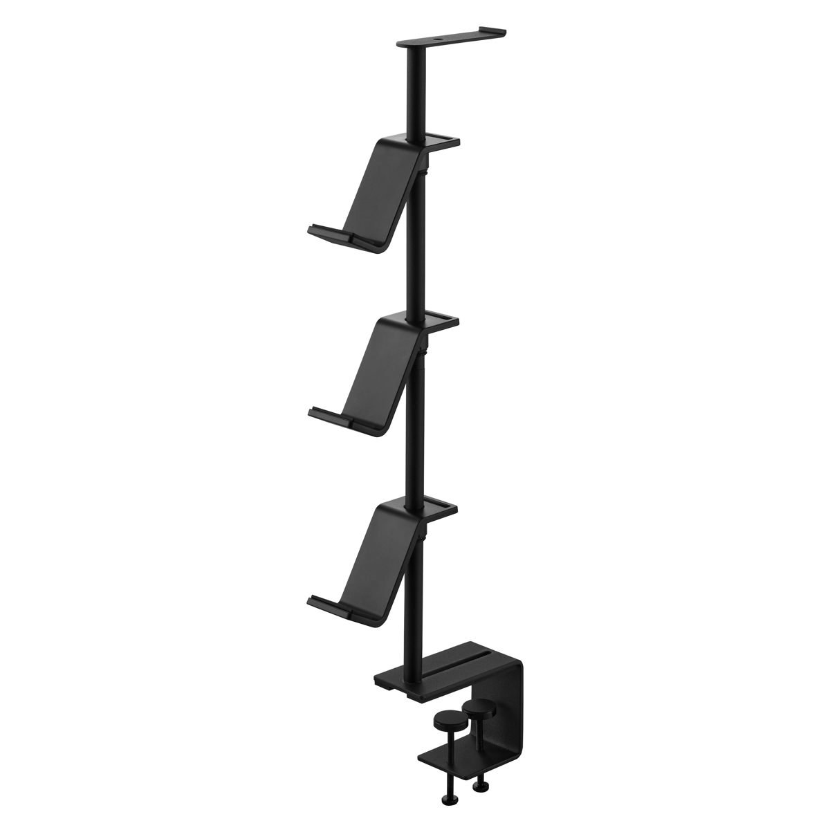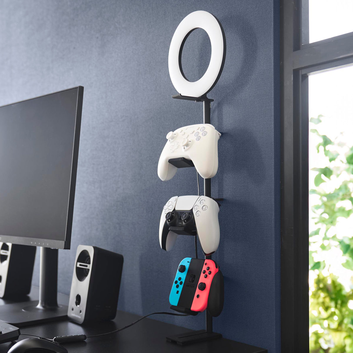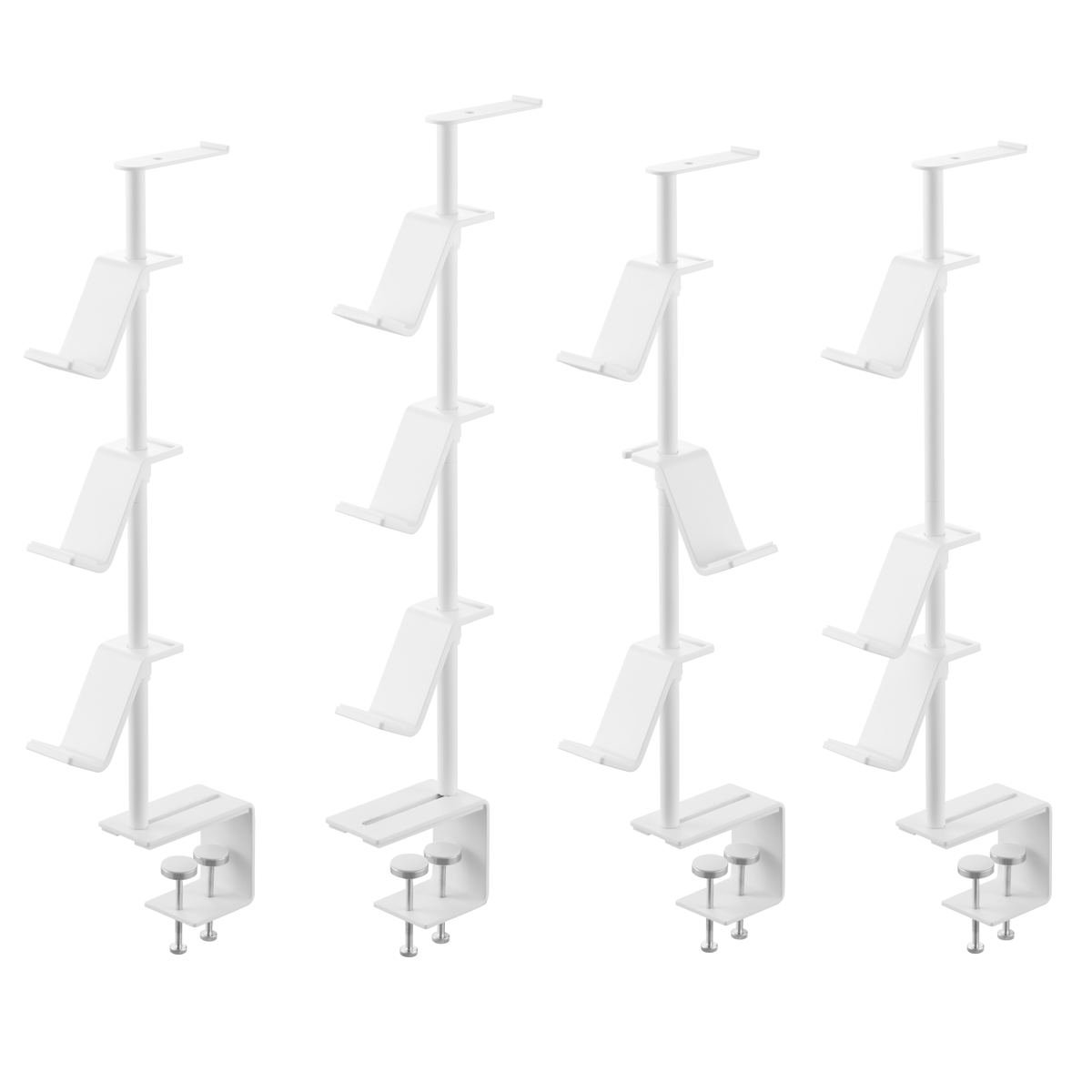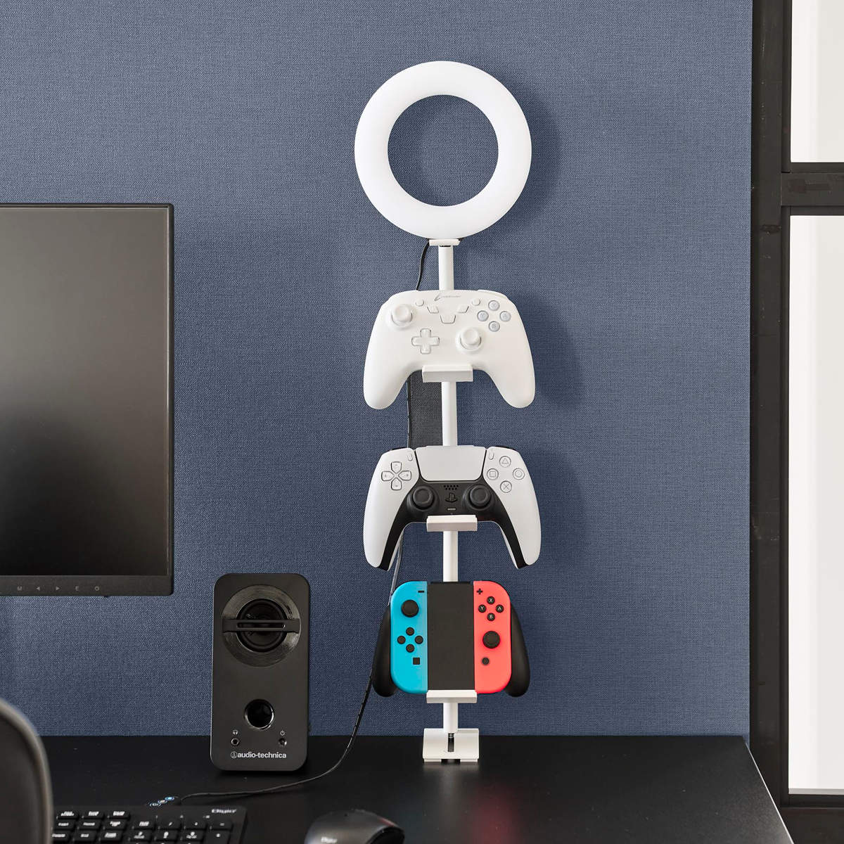 デスクの奥に2個の調節ネジでしっかり固定できるゲームコントローラーを省スペースに収納できるラックです。支柱はスライド式で、置く物に合わせて調整可能です。置き場所に困る形の異なるコントローラーやヘッドセットを引っ掛けるだけでまとめて収納できます。
