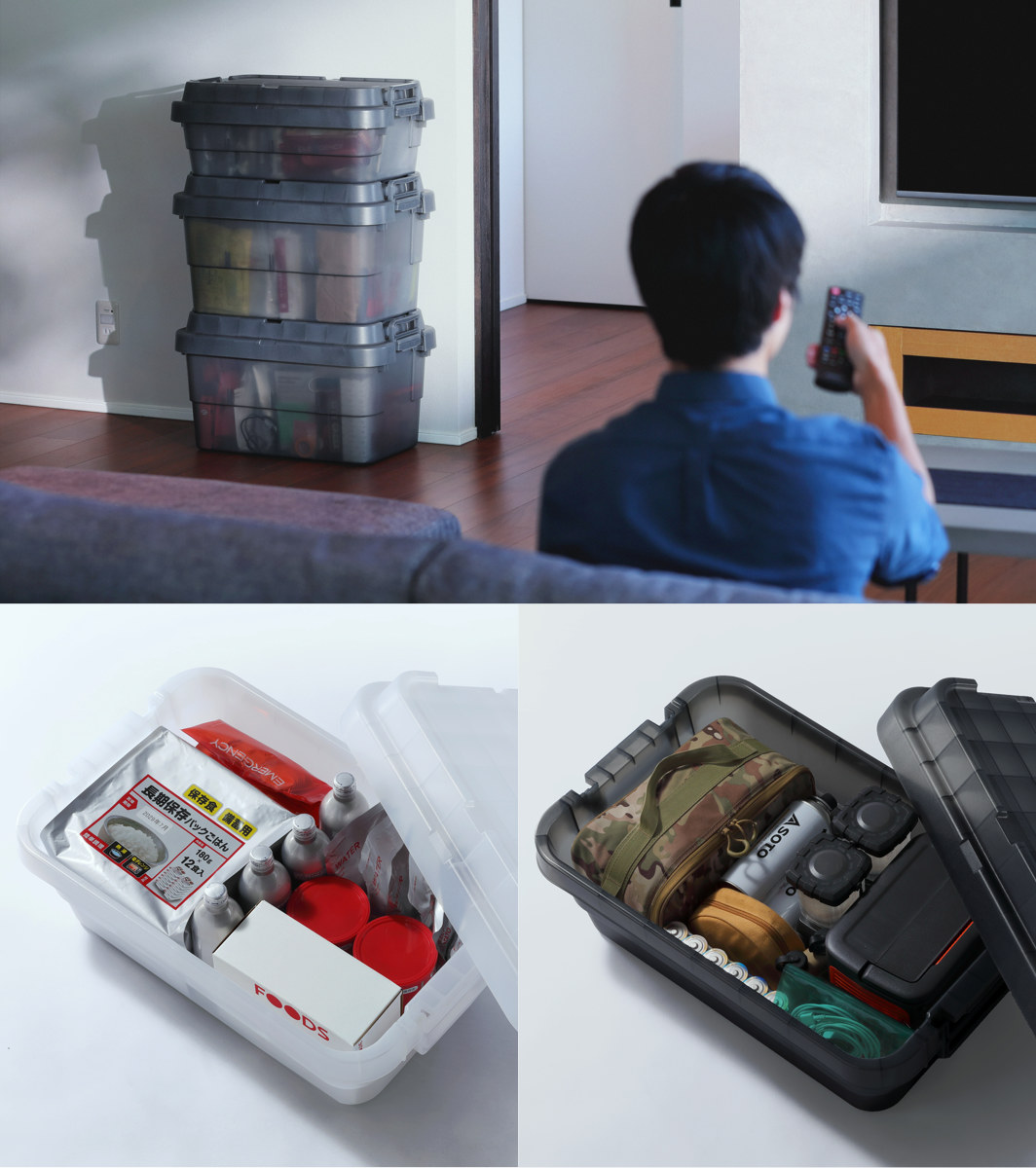 トランクカーゴは、リビングやキッチンなど目につく場所にも置きやすいシンプルなデザイン。防災用品をすぐに使える位置に保管できるだけでなく、手に取りやすい場所に置くことで、使った分を補充していく「ローリングストック」も続けやすくなります。頑丈なつくりで中身をしっかり守るため、防災用ローリングストックの収納ケースとして最適です。