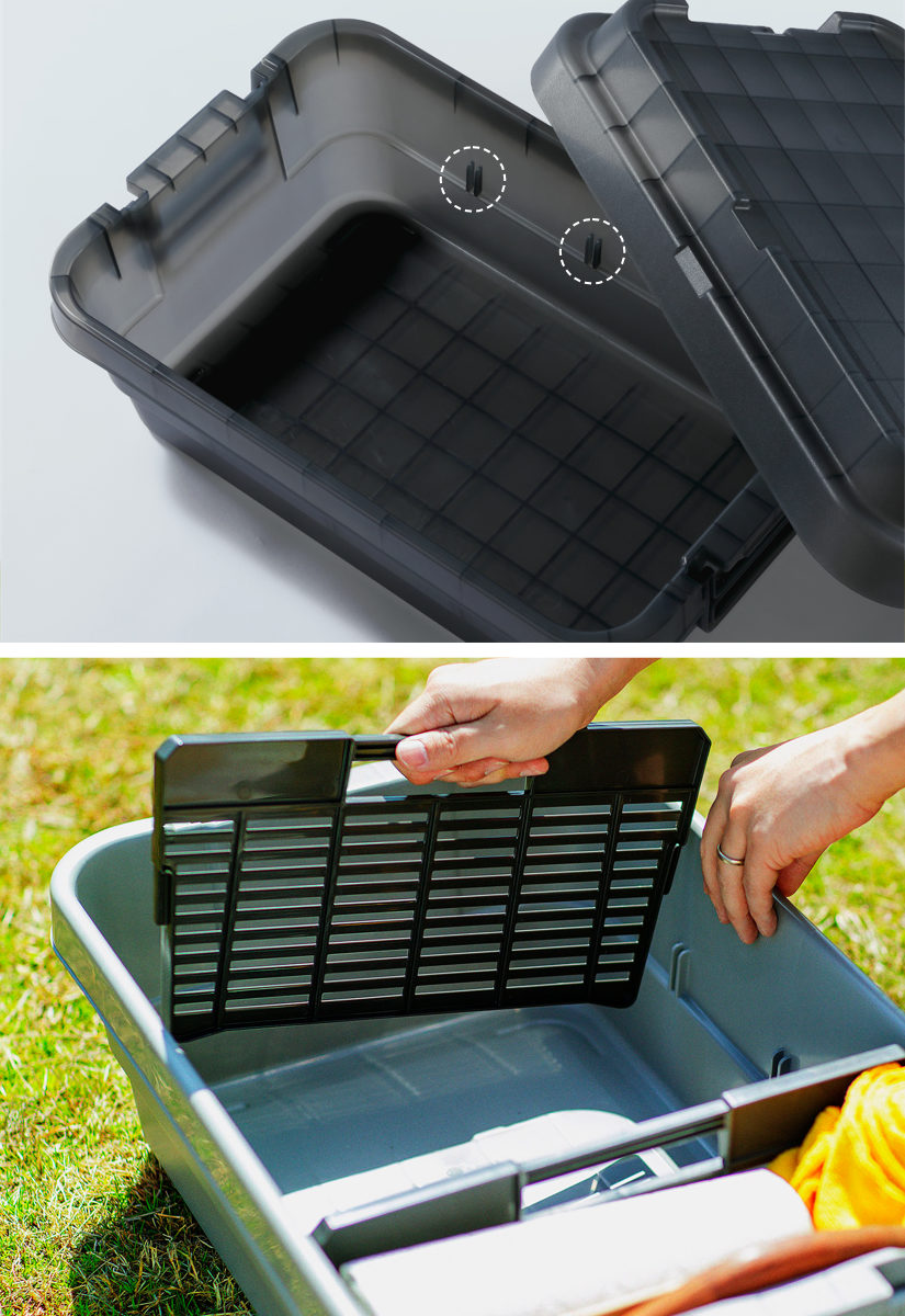 トランクカーゴは水に強く、濡れたサンダルや服の保管にも最適。アウトドアや水辺のレジャーでも活躍します。雨やホコリが入りにくいフタ構造で、急な雨にも安心。ハードタイプなので、壊れやすい照明器具なども安心して収納できます。水や汚れがついてもサッと拭くだけでお手入れも簡単。お子様の外遊び用おもちゃの収納にも便利です。