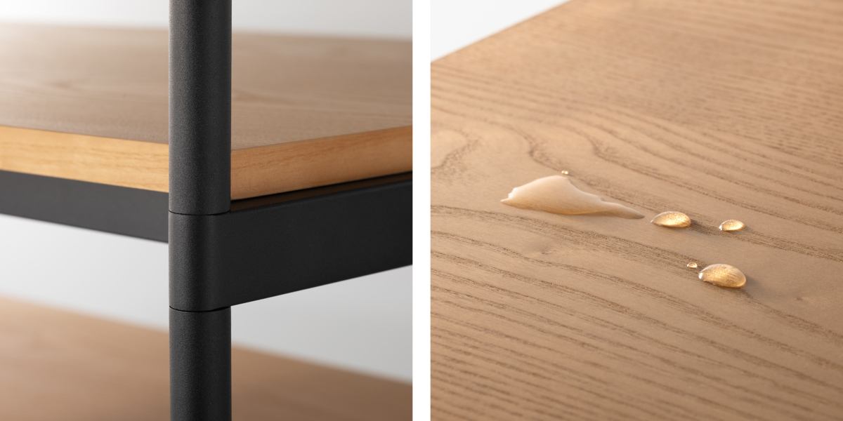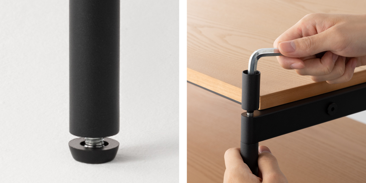 | 材質 | 本体:鉄(粉体塗装) 天板:天然木突板(ラッカー塗装) 芯材:MDF エンドキャップ:ポリプロピレン アジャスター:鉄・ポリプロピレン |