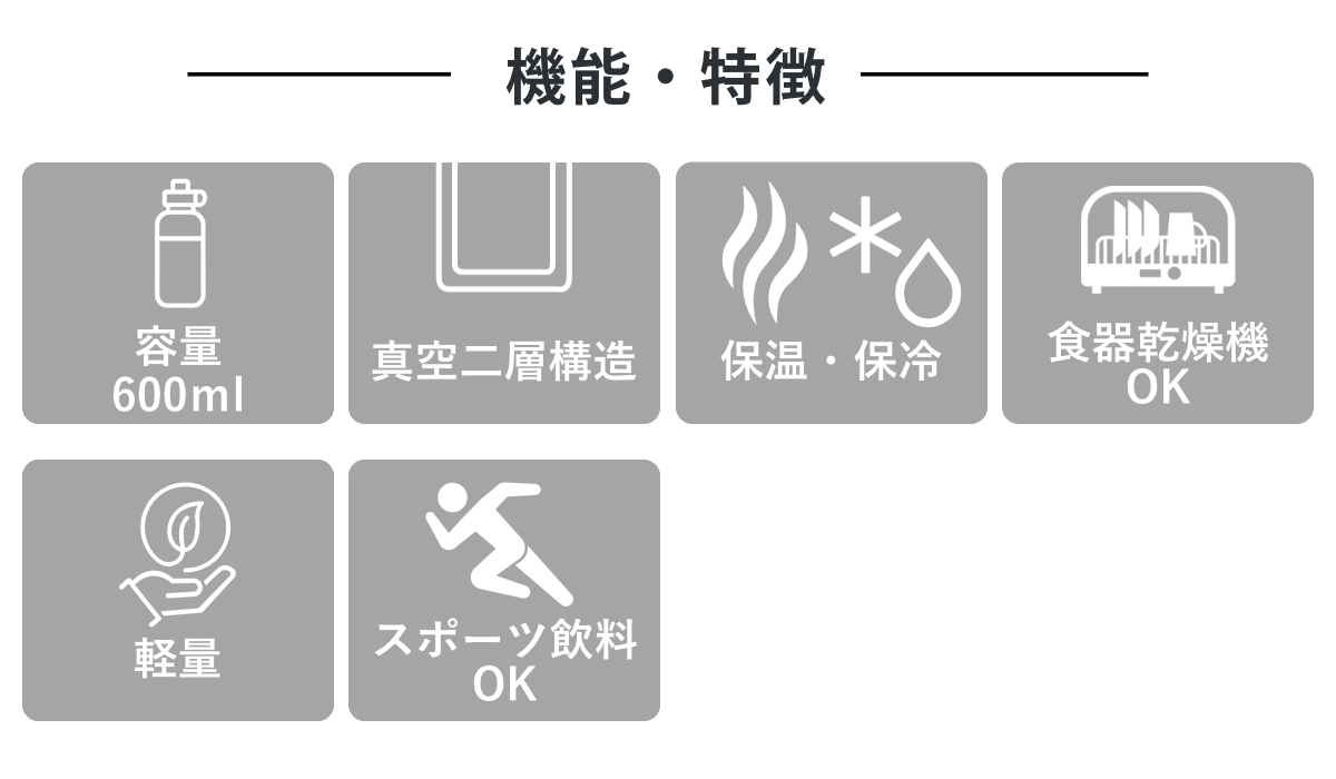 | 材質 | 内びん・胴部・肩部:ステンレス鋼 栓:ポリプロピレン パッキン:シリコーンゴム |