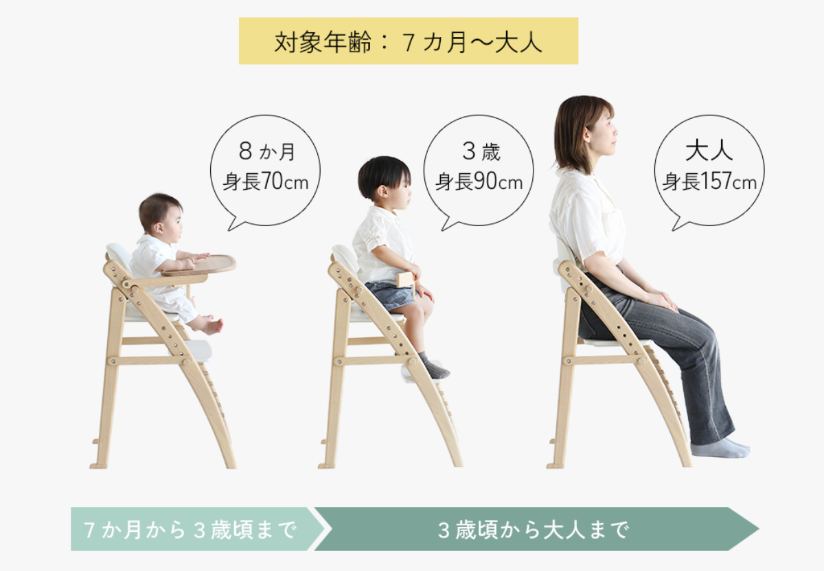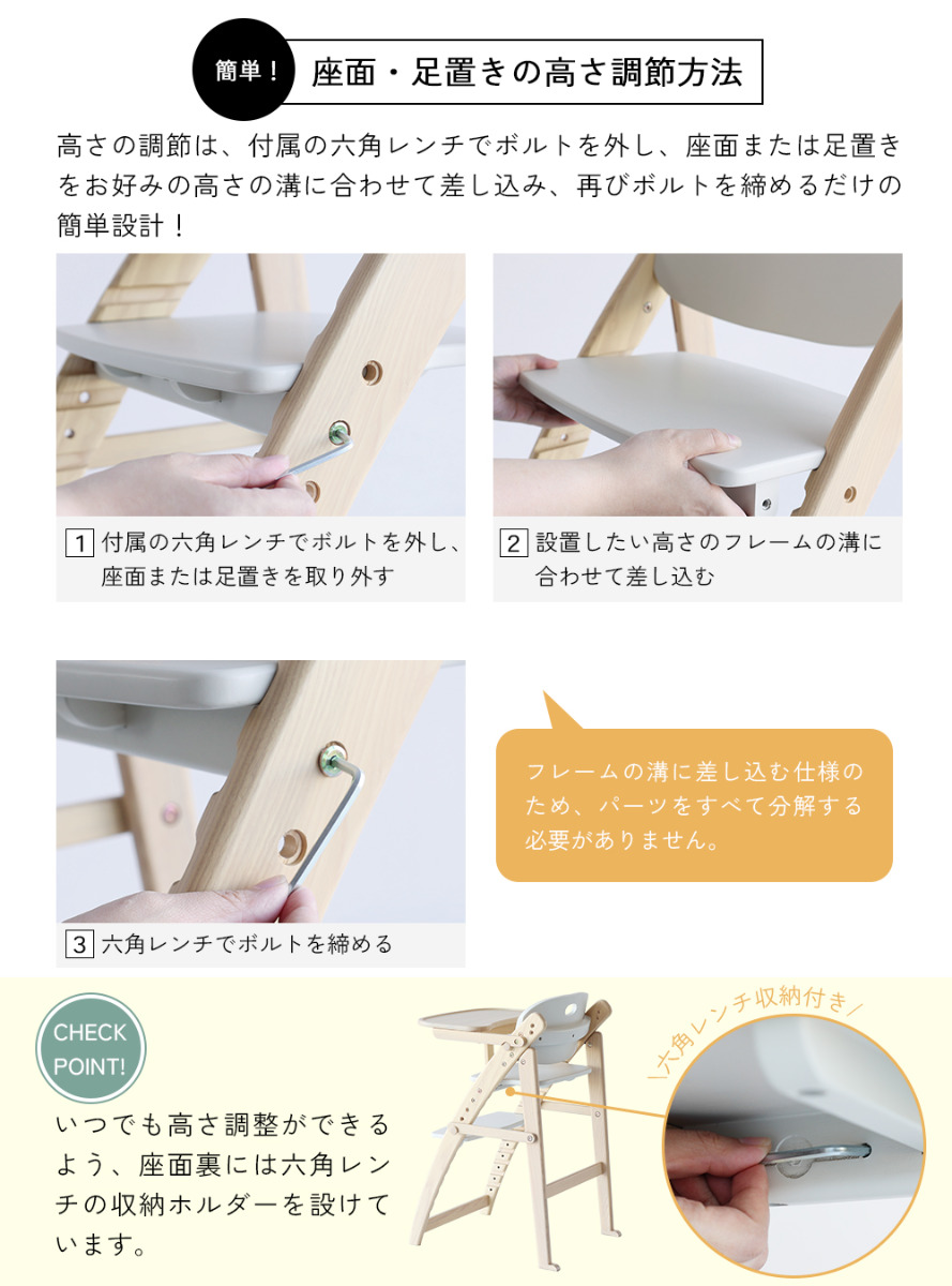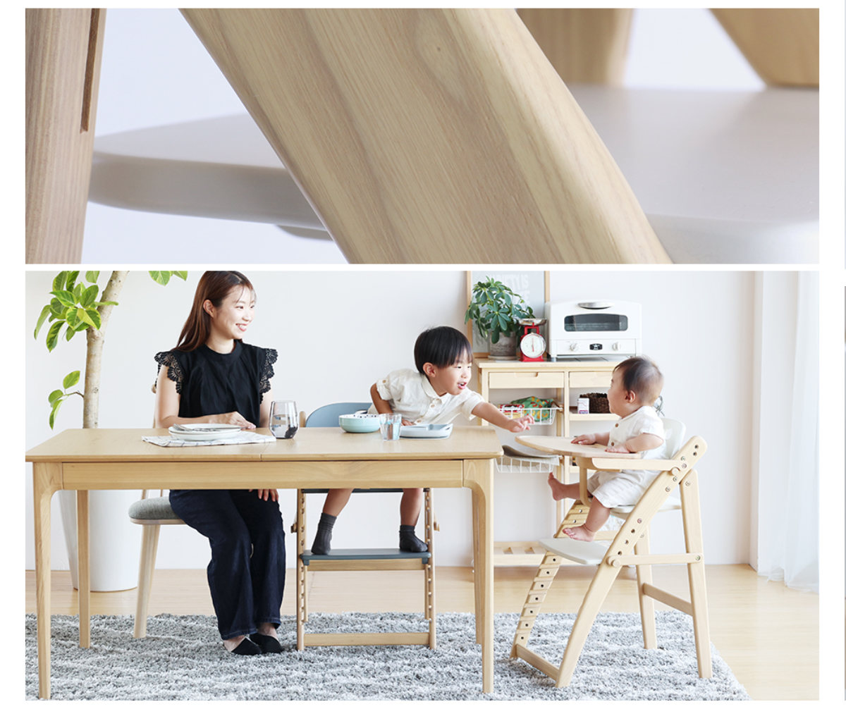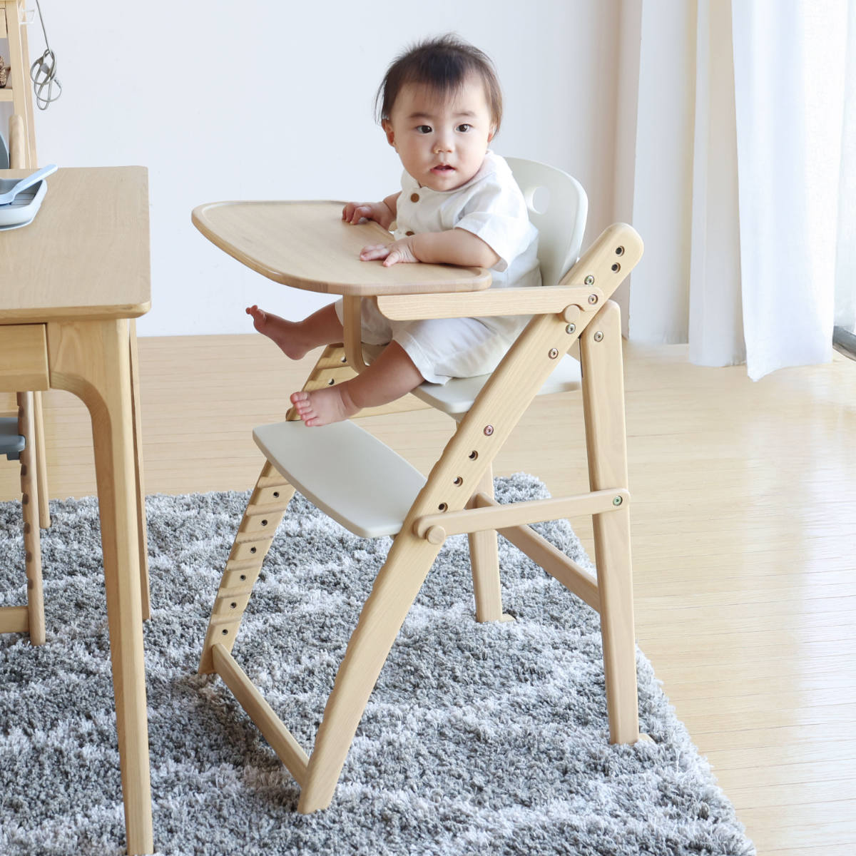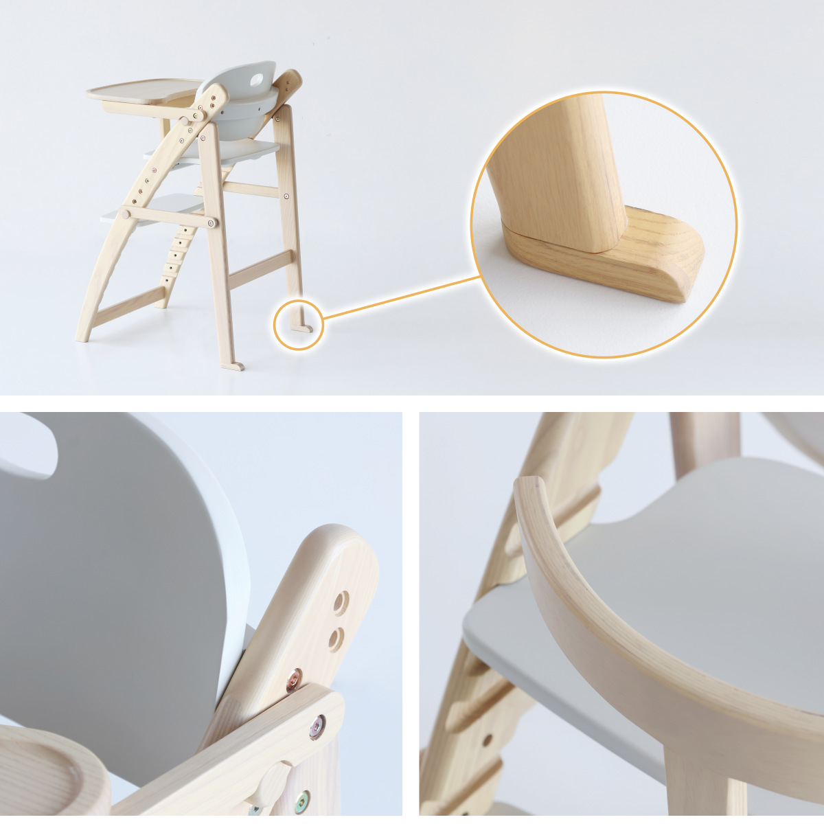 天然木アッシュ材を使用した、上質な風合いのハイチェアです。木のぬくもりを感じるデザインと、コンパクトに折りたためる機能性を両立しました。また、座面や背もたれを細かく調整できるので、子どもから大人まで、長くご愛用いただけます。