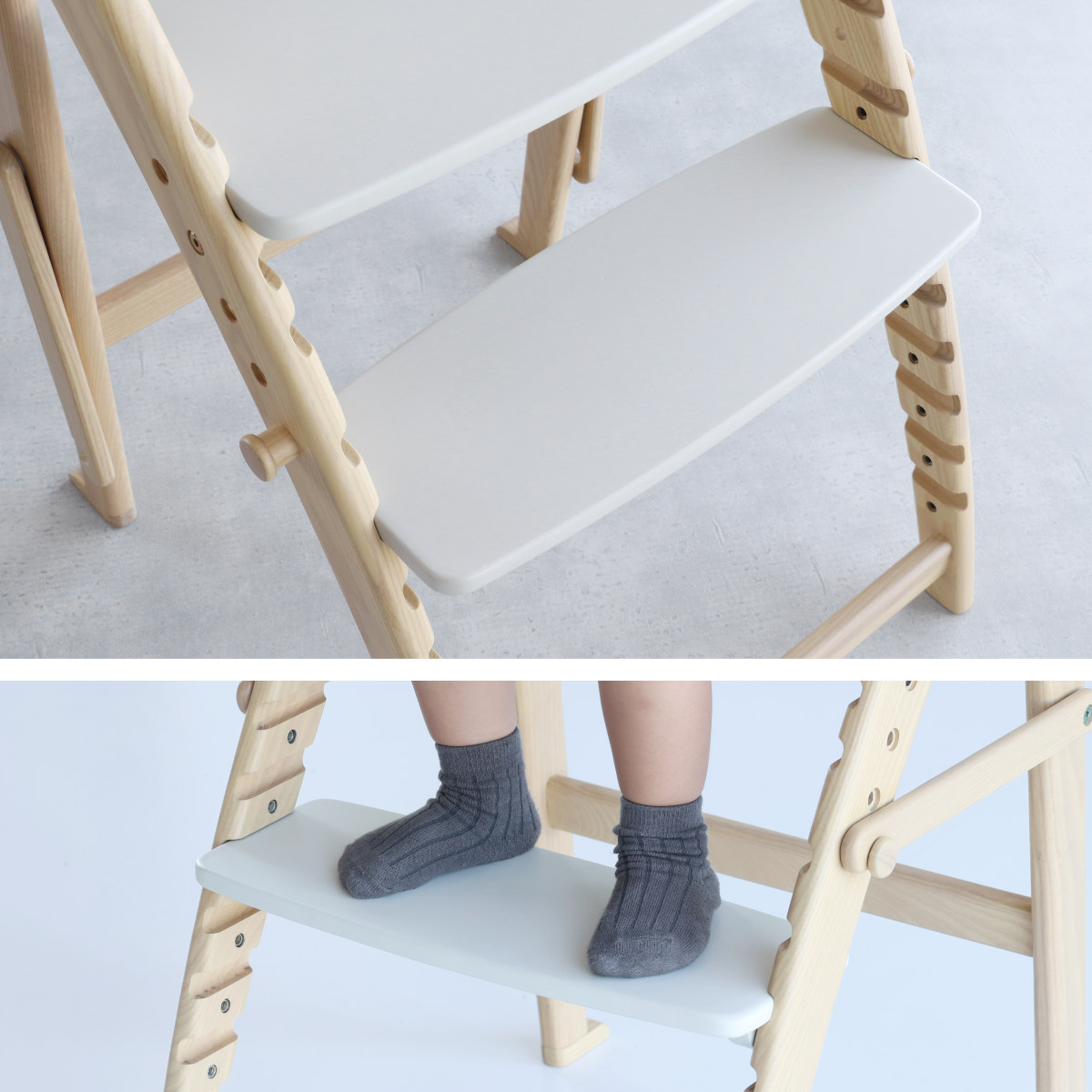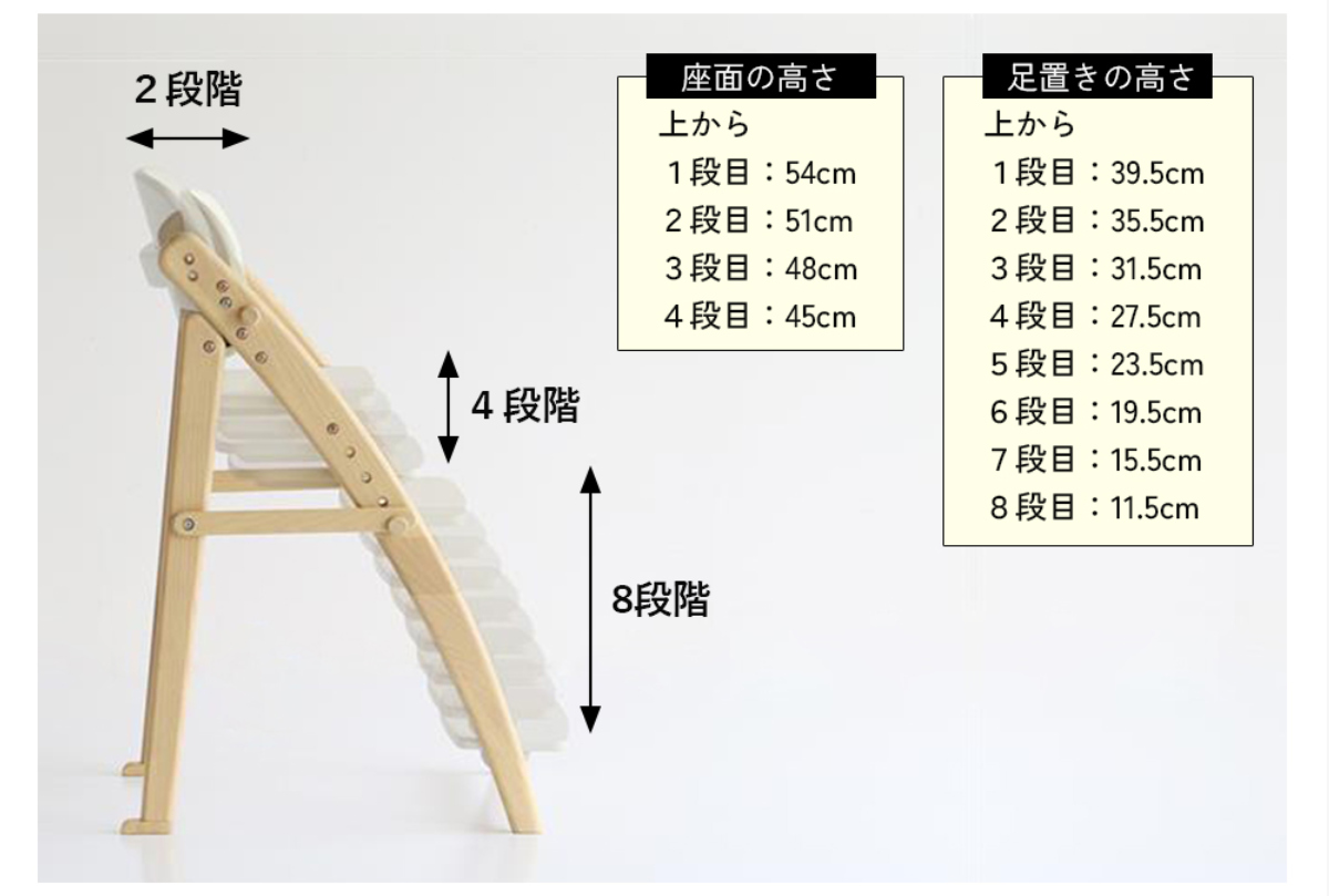 背もたれ2段階、座面4段階、足置き8段階の細やかな調整が可能です。お子様の成長に合わせて正しい姿勢をサポートします。