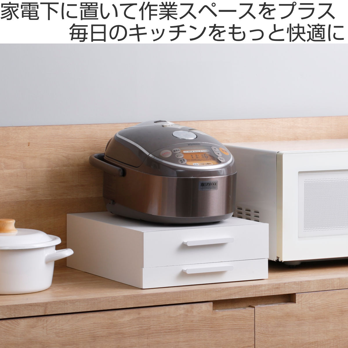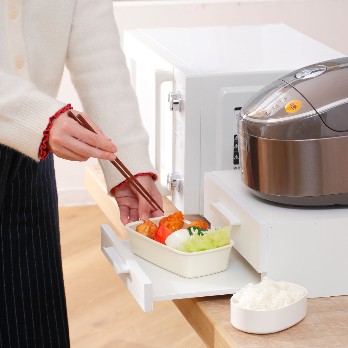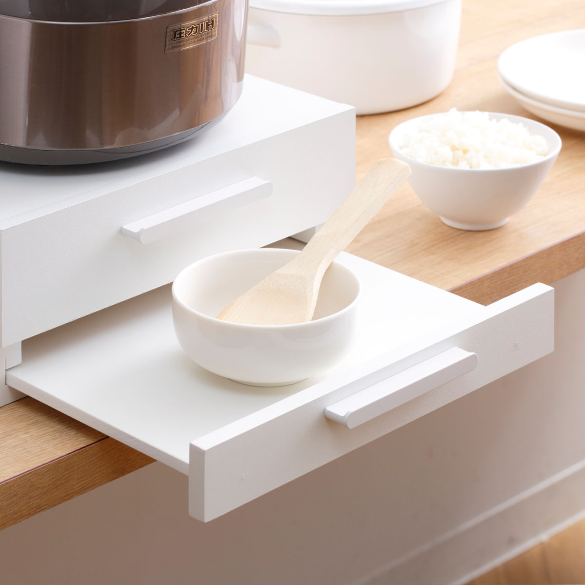 引き出せるトレーは、炊飯時のお茶碗置きや料理の盛り付け、調理中の鍋フタ・調理器具の一時置きなど幅広い用途に使え、家事の作業効率を高めます。