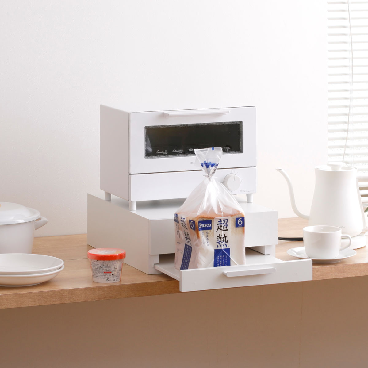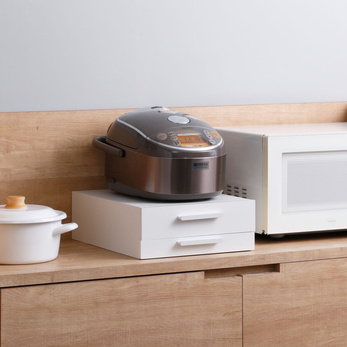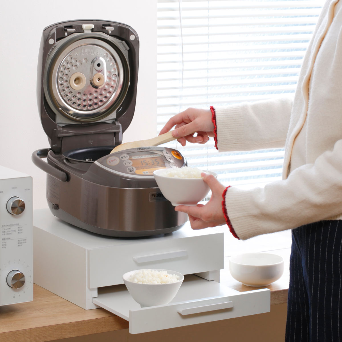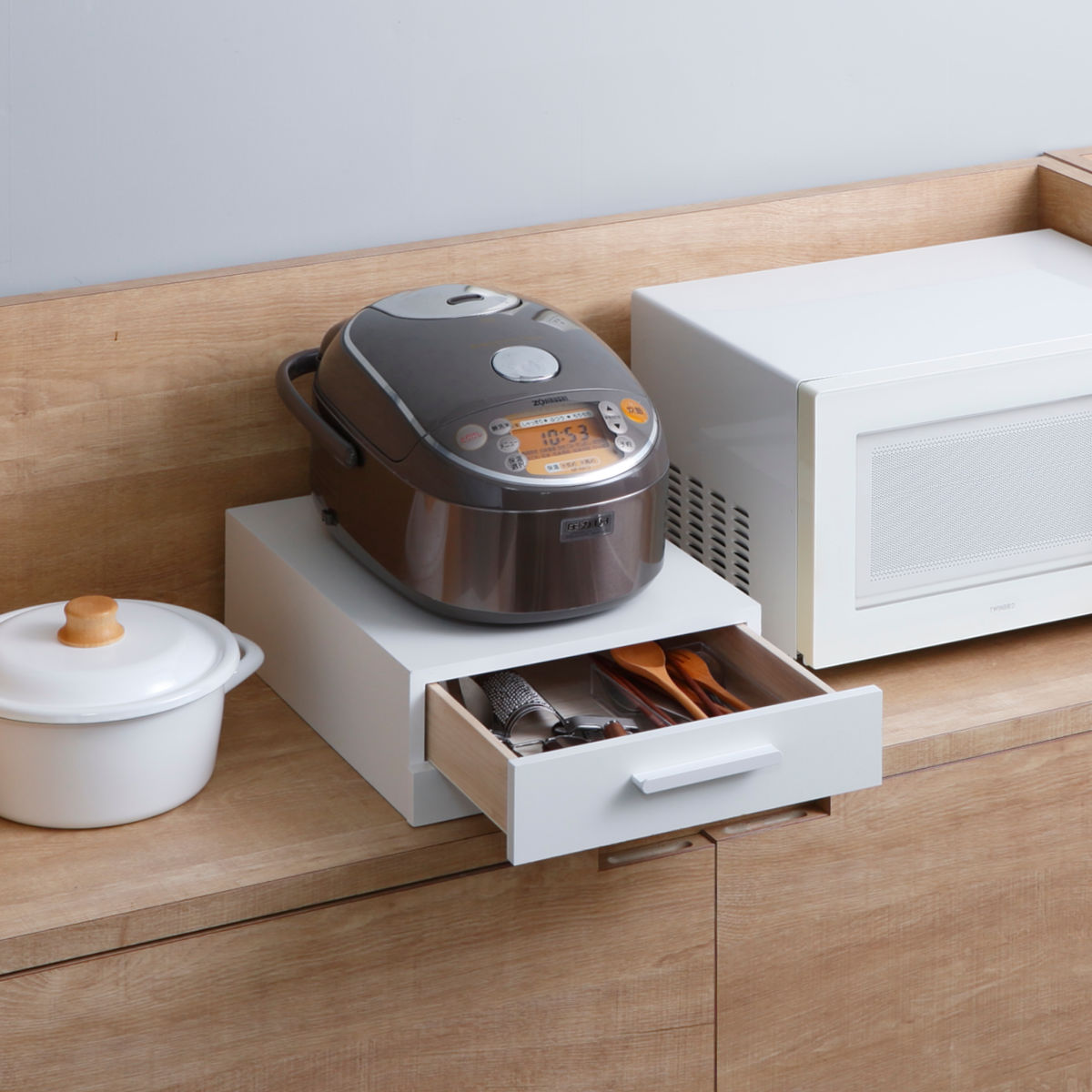 引き出せるトレーは、炊飯時のお茶碗置きや料理の盛り付け、調理中の鍋フタ・調理器具の一時置きなど幅広い用途に使え、家事の作業効率を高めます。