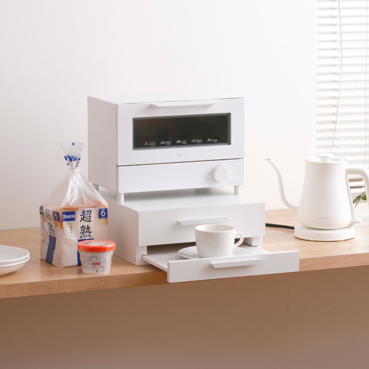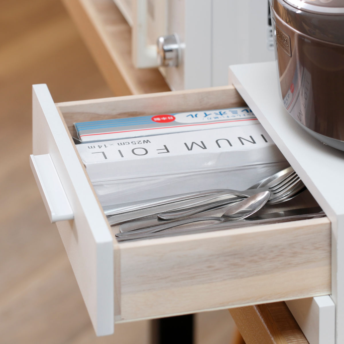 引出しには、カトラリーやラップなどをまとめて収納できるので、キッチン周りがすっきり片付きます。