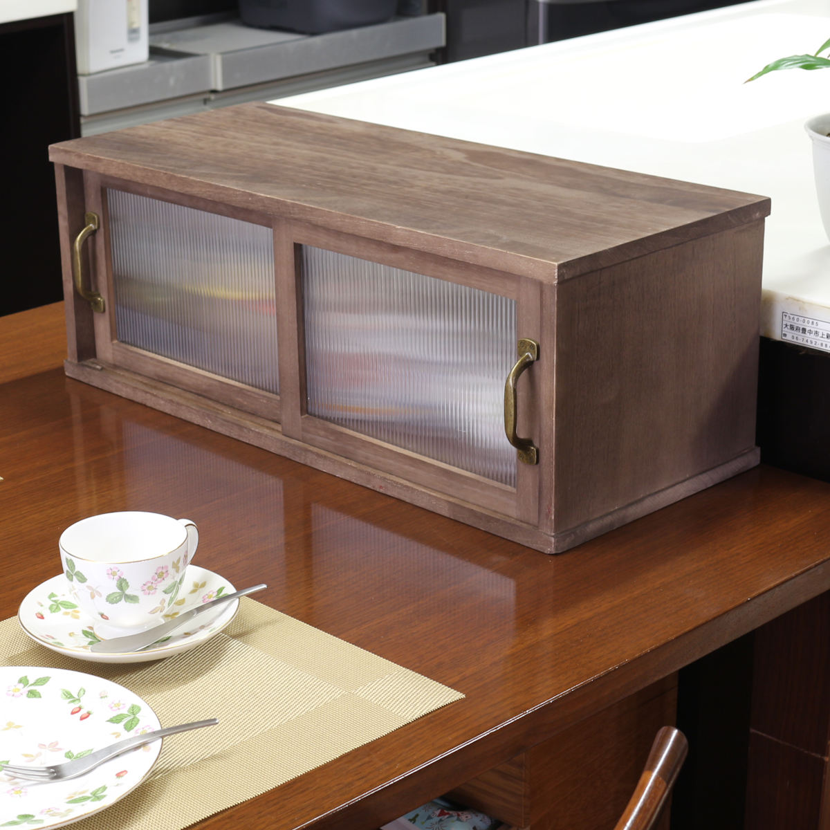 前後どちらからでも取り出せる、便利な収納ラックです。引き戸は両側から開閉できる設計なので、キッチンカウンターやテーブルの中央など、お好きな場所に設置できます。どこに置いても取り出しやすく作業効率アップにもつながります。