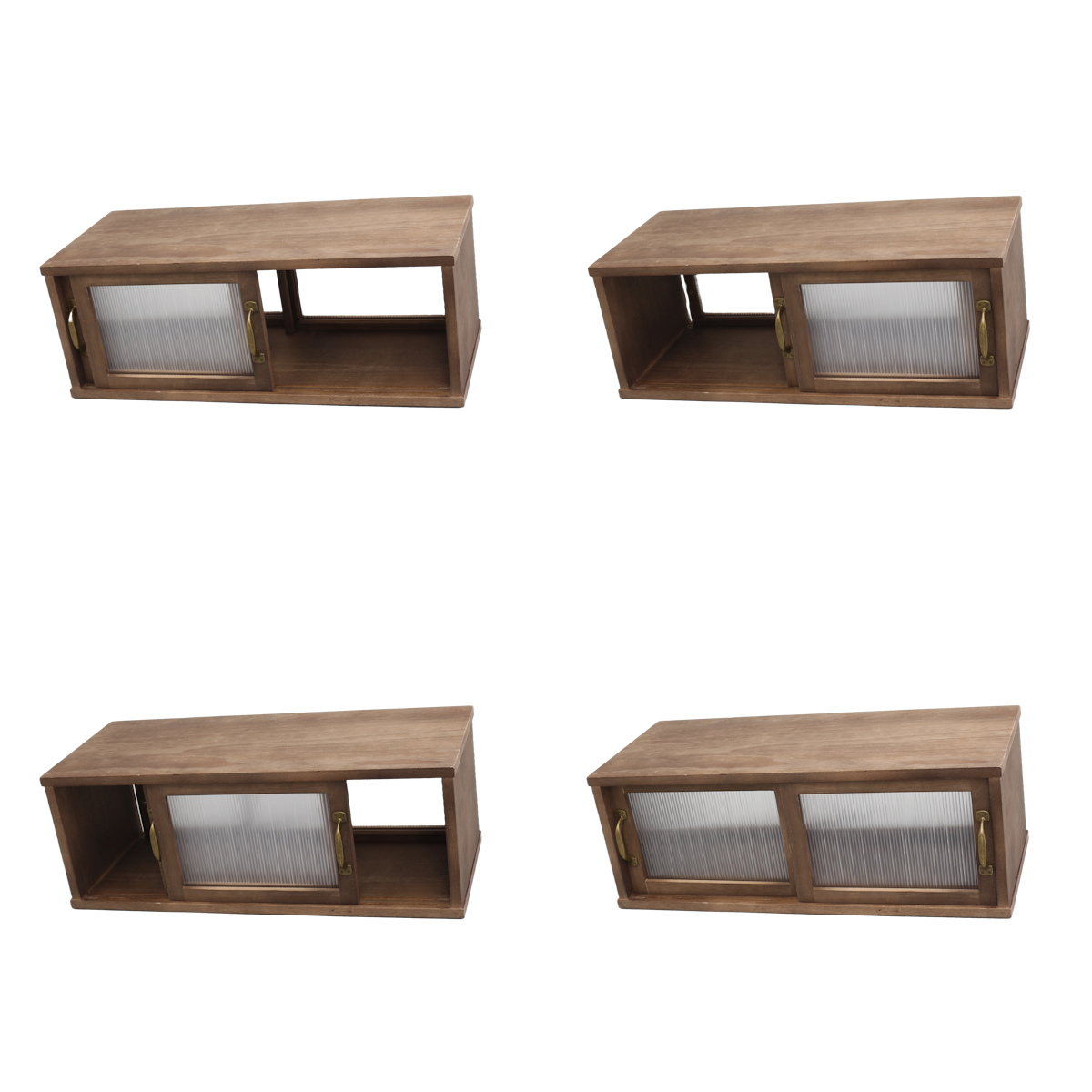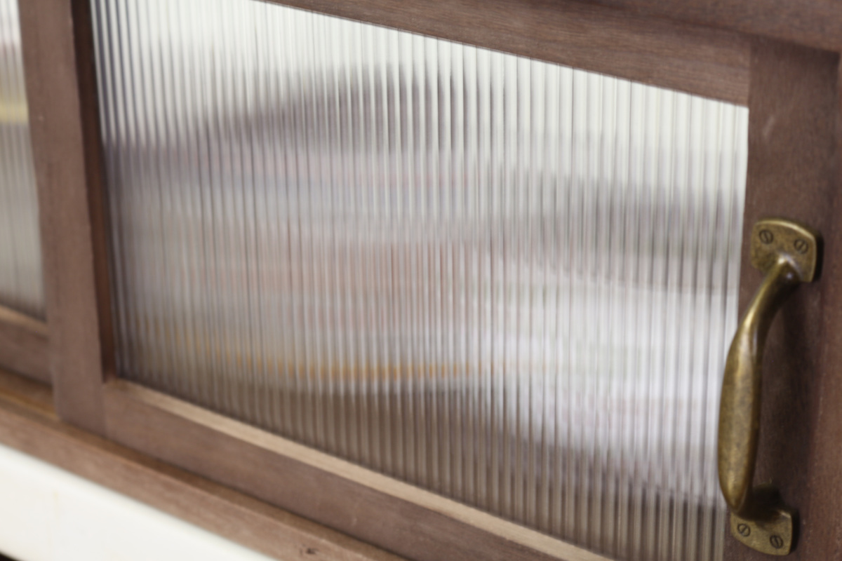 省スペースで開閉ができるスライド式の扉です。ガラス風のポリカーボネートはすりガラス風のデザインで、中が見えにくく生活感を隠してオシャレに収納できます。テーブルに出た小物たちもパッとしまえるので、急な来客にも安心です。