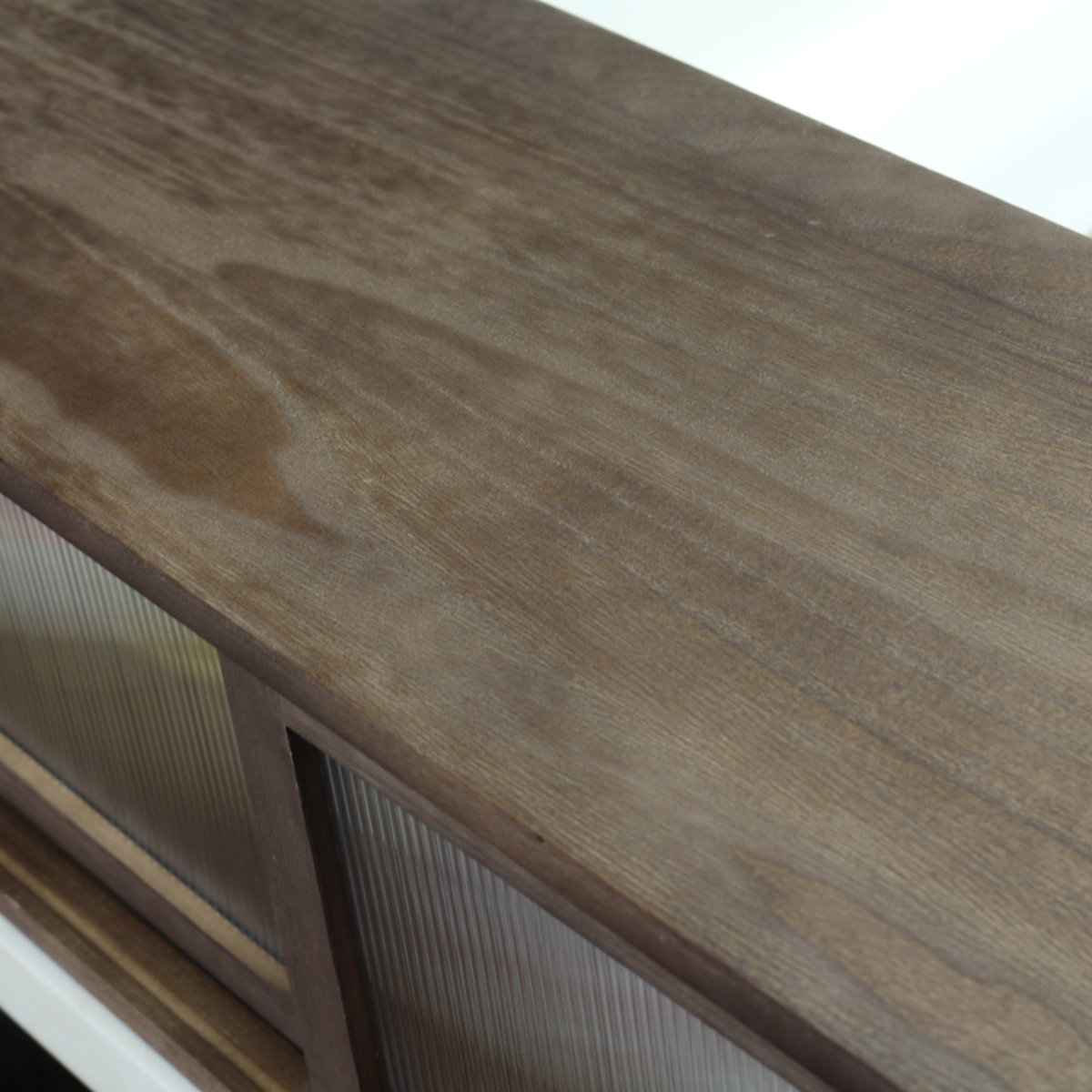 ヴィンテージ家具を思わせる、くすみブラウンの木目と、レトロな味わいのある金属取っ手が絶妙に調和しています。キッチンやダイニングに自然と馴染みつつ、空間のアクセントにもなる大人の佇まいを演出します。